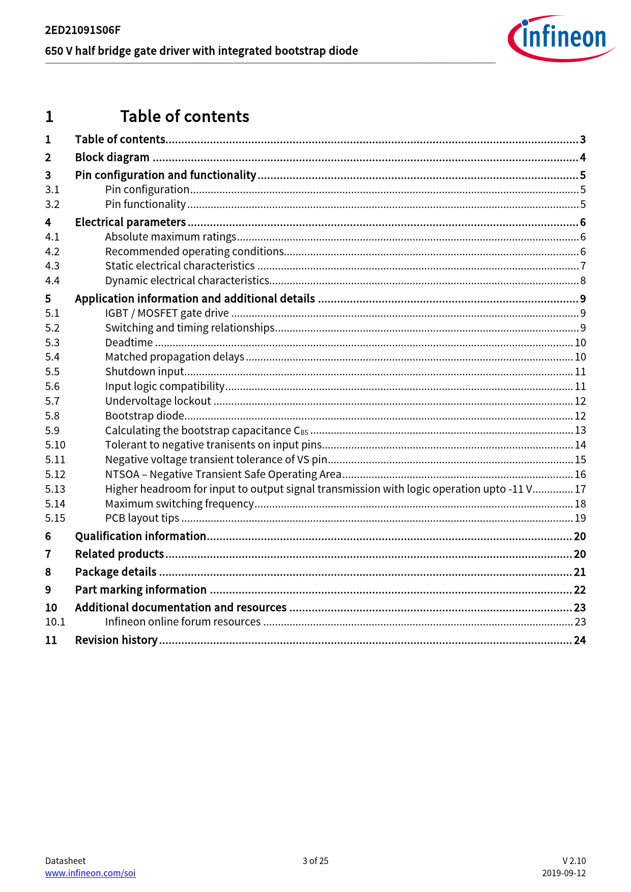 link to page 3 link to page 4 link to page 5 link to page 5 link to page 5 link to page 6 link to page 6 link to page 6 link to page 7 link to page 8 link to page 9 link to page 9 link to page 9 link to page 10 link to page 10 link to page 11 link to page 11 link to page 12 link to page 12 link to page 13 link to page 14 link to page 15 link to page 16 link to page 17 link to page 18 link to page 19 link to page 20 link to page 20 link to page 21 link to page 22 link to page 23 link to page 23 link to page 24 2ED21091S06F 650 V half bridge gate driver with integrated bootstrap diode 1 Table of contents 1 Table of contents.. 3 2 Block diagram .. 4 3 Pin configuration and functionality ... 5 3.1 Pin configuration ... 5 3.2 Pin functionality .. 5 4 Electrical parameters ... 6 4.1 Absolute maximum ratings ... 6 4.2 Recommended operating conditions... 6 4.3 Static electrical characteristics .. 7 4.4 Dynamic electrical characteristics.. 8 5 Application information and additional details .. 9 5.1 IGBT / MOSFET gate drive ... 9 5.2 Switching and timing relationships .. 9 5.3 Deadtime ... 10 5.4 Matched propagation delays .. 10 5.5 Shutdown input ... 11 5.6 Input logic compatibility ... 11 5.7 Undervoltage lockout ... 12 5.8 Bootstrap diode ... 12 5.9 Calculating the bootstrap capacitance CBS .. 13 5.10 Tolerant to negative tranisents on input pins .. 14 5.11 Negative voltage transient tolerance of VS pin .. 15 5.12 NTSOA – Negative Transient Safe Operating Area ... 16 5.13 Higher headroom for input to output signal transmission with logic operation upto -11 V .. 17 5.14 Maximum switching frequency ... 18 5.15 PCB layout tips .. 19 6 Qualification information ... 20 7 Related products .. 20 8 Package details .. 21 9 Part marking information .. 22 10 Additional documentation and resources ... 23 10.1 Infineon online forum resources .. 23 11 Revision history .. 24 Datasheet 3 of 25 V 2.10 www.infineon.com/soi 2019-09-12 Document Outline Features Product summary Potential applications Product validation Ordering information Description 1 Table of contents 2 Block diagram 3 Pin configuration and functionality 3.1 Pin configuration 3.2 Pin functionality 4 Electrical parameters 4.1 Absolute maximum ratings 4.2 Recommended operating conditions 4.3 Static electrical characteristics 4.4 Dynamic electrical characteristics 5 Application information and additional details 5.1 IGBT / MOSFET gate drive 5.2 Switching and timing relationships 5.3 Deadtime 5.4 Matched propagation delays 5.5 Shutdown input 5.6 Input logic compatibility 5.7 Undervoltage lockout 5.8 Bootstrap diode 5.9 Calculating the bootstrap capacitance CBS 5.10 Tolerant to negative tranisents on input pins 5.11 Negative voltage transient tolerance of VS pin 5.12 NTSOA – Negative Transient Safe Operating Area 5.13 Higher headroom for input to output signal transmission with logic operation upto -11 V 5.14 Maximum switching frequency 5.15 PCB layout tips 6 Qualification information0F 7 Related products 8 Package details 9 Part marking information 10 Additional documentation and resources 10.1 Infineon online forum resources 11 Revision history