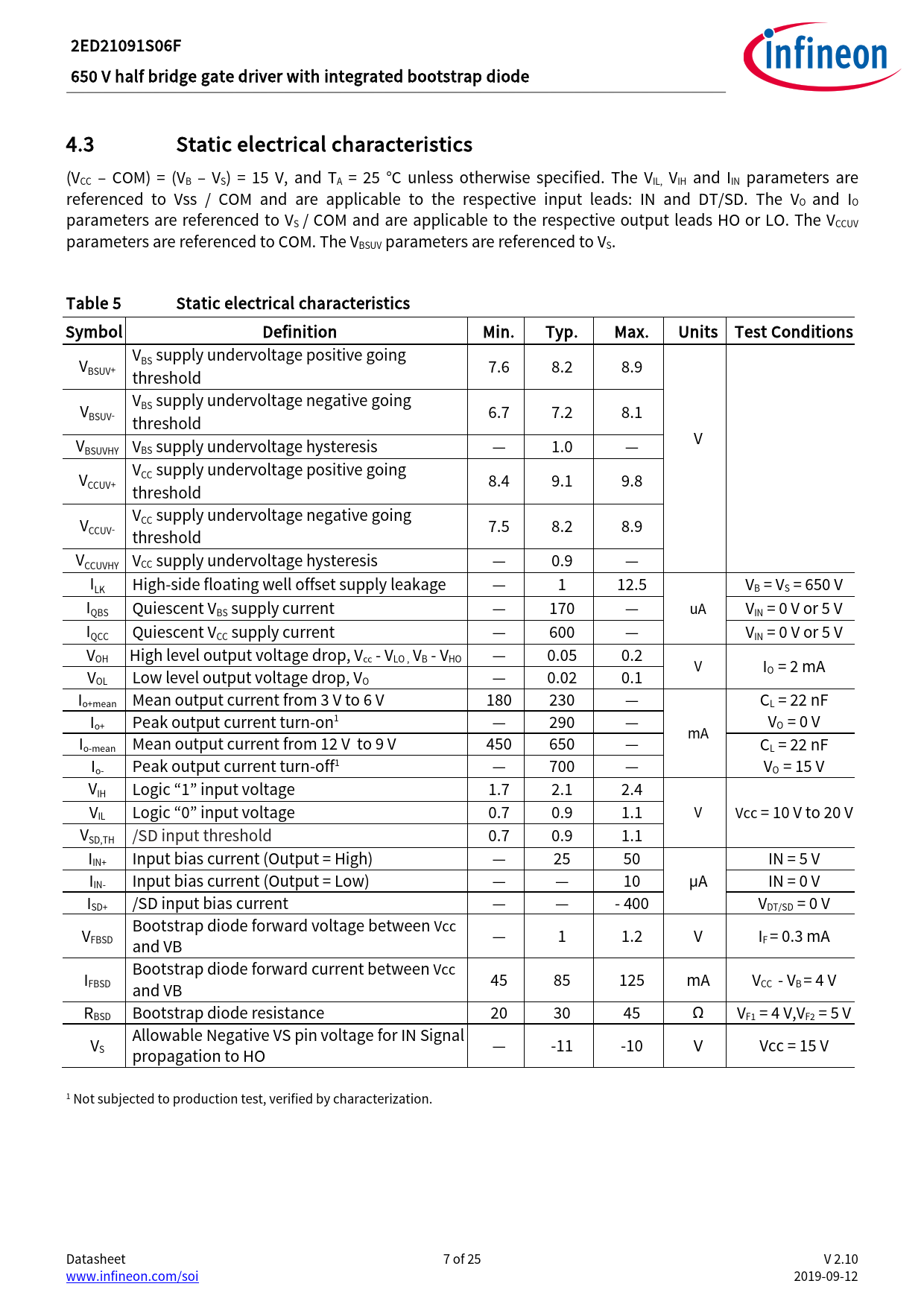 2ED21091S06F. 650. V. half. bridge. gate. driver. with. integrated. bootstrap. diode. 4.3. Static. electrical. characteristics. (VCC. –. COM). =. (VB. –. VS). =. 15
