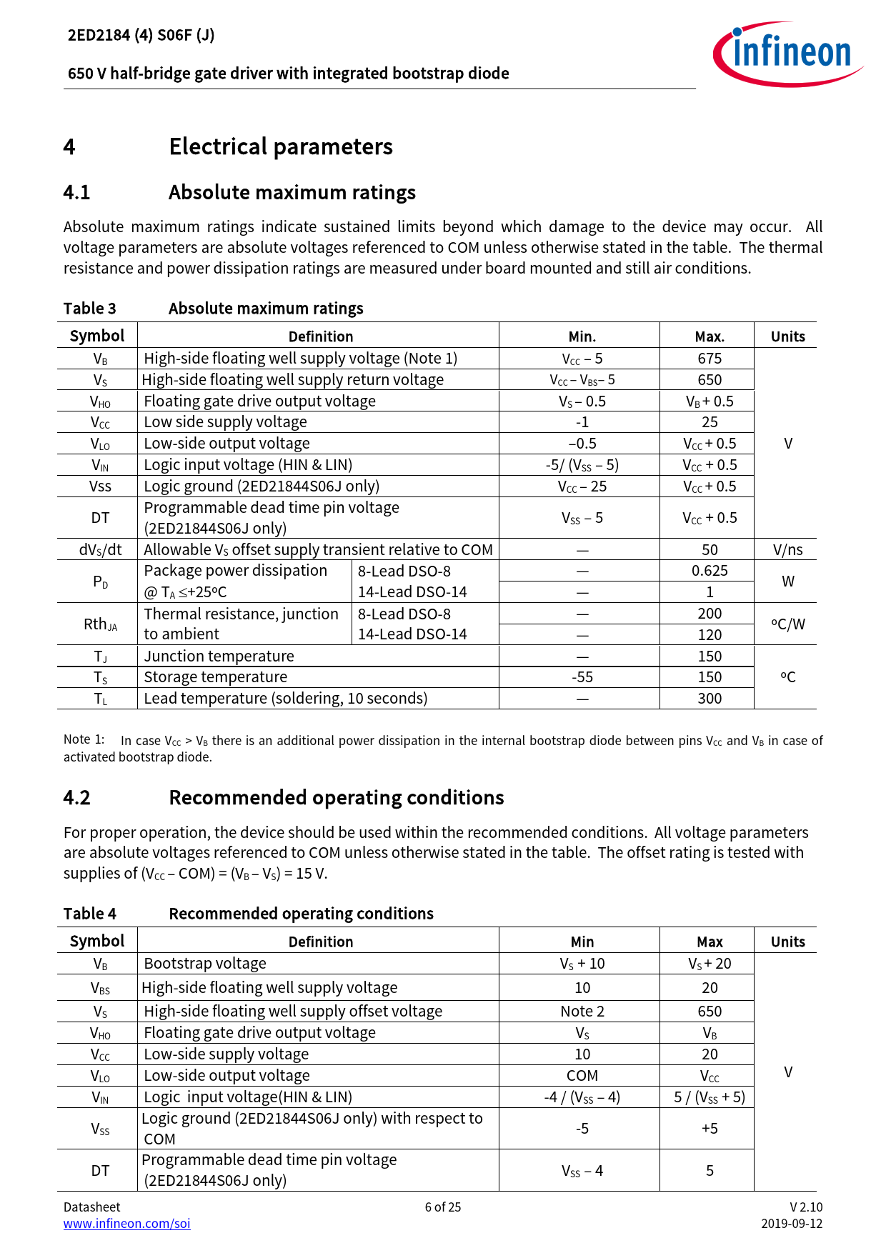 2ED2184. (4). S06F. (J). 650. V. half-bridge. gate. driver. with. integrated. bootstrap. diode. 4. Electrical. parameters. 4.1. Absolute. maximum. ratings
