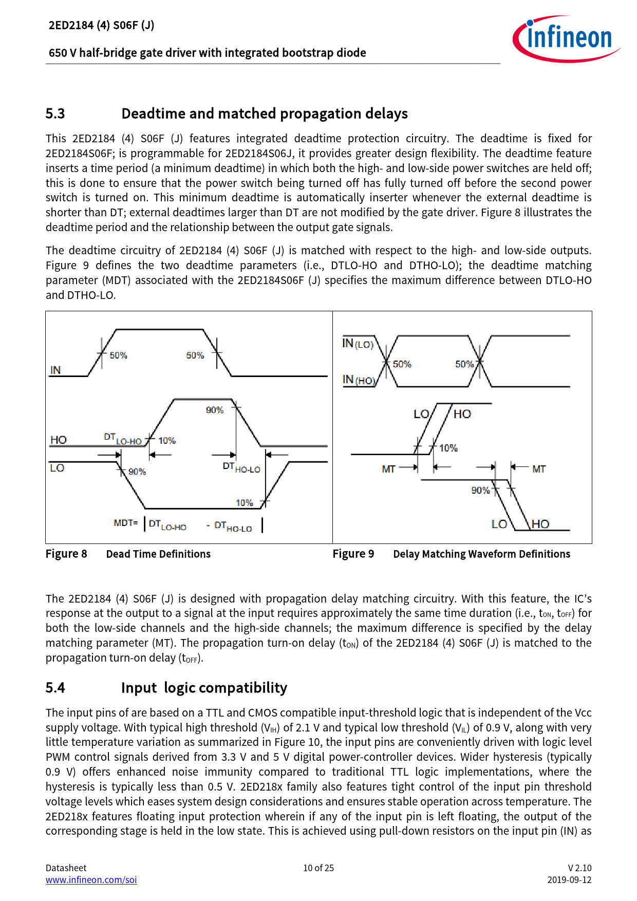 2ED2184 (4) S06F (J) 650 V half-bridge gate driver with integrated bootstrap diode 5.3 Deadtime and matched propagation delays This 2ED2184 (4) S06F (J) features integrated deadtime protection circuitry. The deadtime is fixed for 2ED2184S06F; is programmable for 2ED2184S06J, it provides greater design flexibility. The deadtime feature inserts a time period (a minimum deadtime) in which both the high- and low-side power switches are held off; this is done to ensure that the power switch being turned off has fully turned off before the second power switch is turned on. This minimum deadtime is automatical y inserter whenever the external deadtime is shorter than DT; external deadtimes larger than DT are not modified by the gate driver. Figure 8 illustrates the deadtime period and the relationship between the output gate signals. The deadtime circuitry of 2ED2184 (4) S06F (J) is matched with respect to the high- and low-side outputs. Figure 9 defines the two deadtime parameters (i.e., DTLO-HO and DTHO-LO); the deadtime matching parameter (MDT) associated with the 2ED2184S06F (J) specifies the maximum difference between DTLO-HO and DTHO-LO. Figure 8 Dead Time Definitions Figure 9 Delay Matching Waveform Definitions The 2ED2184 (4) S06F (J) is designed with propagation delay matching circuitry. With this feature, the IC’s response at the output to a signal at the input requires approximately the same time duration (i.e., tON, tOFF) for both the low-side channels and the high-side channels; the maximum difference is specified by the delay matching parameter (MT). The propagation turn-on delay (tON) of the 2ED2184 (4) S06F (J) is matched to the propagation turn-on delay (tOFF). 5.4 Input logic compatibility The input pins of are based on a TTL and CMOS compatible input-threshold logic that is independent of the Vcc supply voltage. With typical high threshold (VIH) of 2.1 V and typical low threshold (VIL) of 0.9 V, along with very little temperature variation as summarized in Figure 10, the input pins are conveniently driven with logic level PWM control signals derived from 3.3 V and 5 V digital power-control er devices. Wider hysteresis (typical y 0.9 V) offers enhanced noise immunity compared to traditional TTL logic implementations, where the hysteresis is typically less than 0.5 V. 2ED218x family also features tight control of the input pin threshold voltage levels which eases system design considerations and ensures stable operation across temperature. The 2ED218x features floating input protection wherein if any of the input pin is left floating, the output of the corresponding stage is held in the low state. This is achieved using pull-down resistors on the input pin (IN) as Datasheet 10 of 25 V 2.10 www.infineon.com/soi 2019-09-12 Document Outline Features Product summary Product validation Description 1 Table of contents 2 Block diagram 3 Pin configuration and functionality 3.1 Pin configuration 3.2 Pin functionality 4 Electrical parameters 4.1 Absolute maximum ratings 4.2 Recommended operating conditions 4.3 Static electrical characteristics 4.4 Dynamic electrical characteristics 5 Application information and additional details 5.1 IGBT / MOSFET gate drive 5.2 Switching and timing relationships 5.3 Deadtime and matched propagation delays 5.4 Input logic compatibility 5.5 Undervoltage lockout 5.6 Shutdown Input 5.7 Bootstrap diode 5.8 Calculating the bootstrap capacitance CBS 5.9 Tolerant to negative tranisents on input pins 5.10 Negative voltage transient tolerance of VS pin 5.11 NTSOA – Negative Transient Safe Operating Area 5.12 Higher headroom for input to output signal transmission with logic operation upto -11 V 5.13 Maximum switching frequency 5.14 PCB layout tips 6 Qualification information0F 7 Related products 8 Package details 9 Part marking information 10 Additional documentation and resources 10.1 Infineon online forum resources 11 Revision history