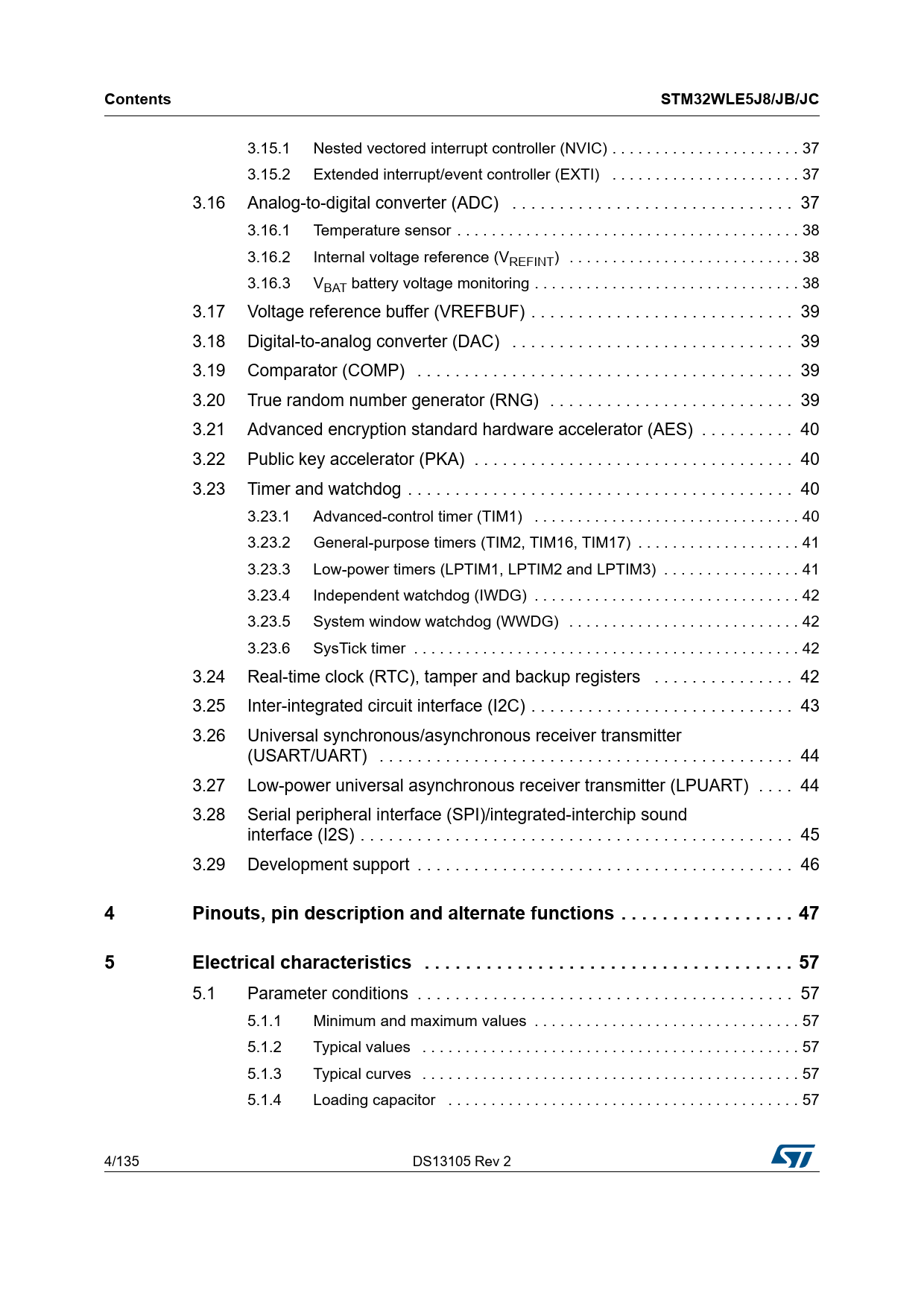 Contents. STM32WLE5J8/JB/JC. Pinouts, pin description and alternate functions . 47. Electrical characteristics . 57