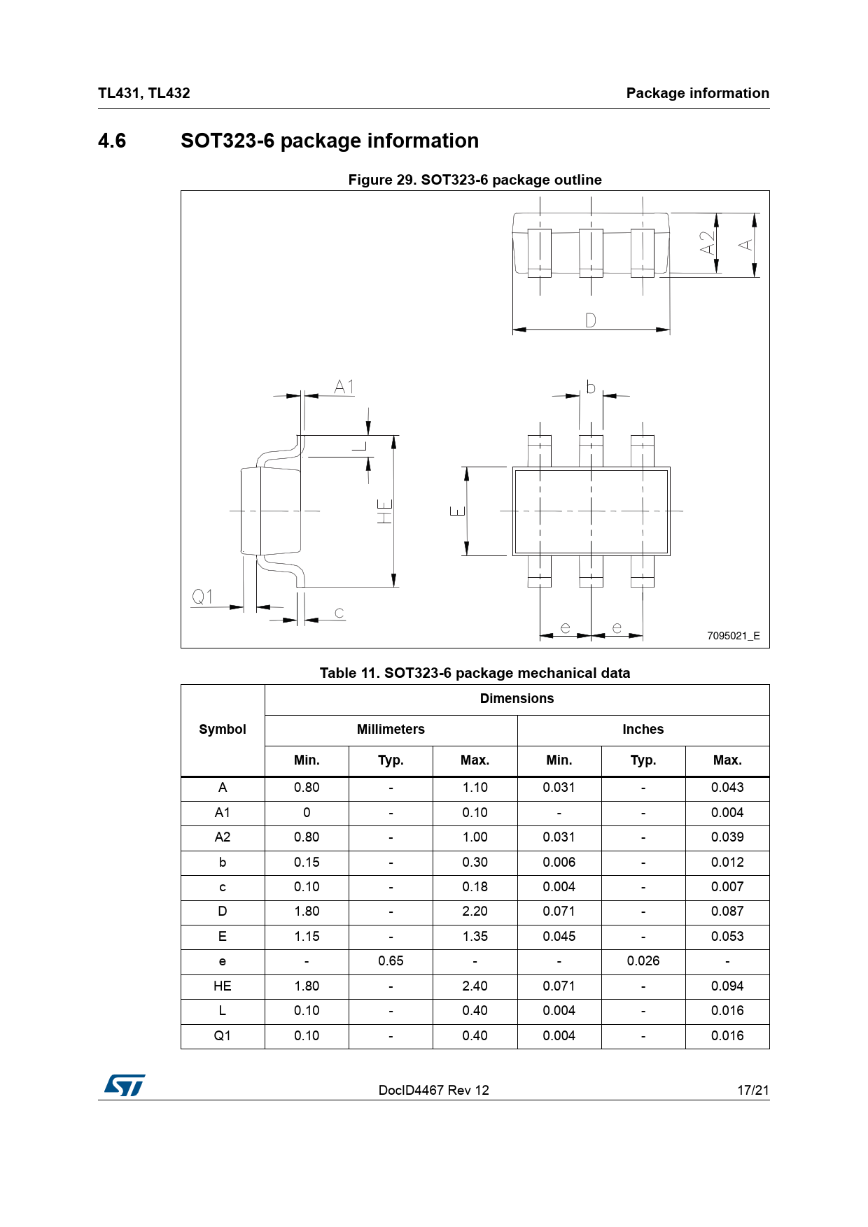 TL431, TL432Package information4.6 SOT323-6packageinformationFigure 29. SOT323-6 package outline 7095021_E Table 11. SOT323-6 package mechanical dataDimensionsSymbolMillimetersInchesMin.Typ.Max.Min.Typ.Max. A 0.80 - 1.10 0.031 - 0.043 A1 0 - 0.10 - - 0.004 A2 0.80 - 1.00 0.031 - 0.039 b 0.15 - 0.30 0.006 - 0.012 c 0.10 - 0.18 0.004 - 0.007 D 1.80 - 2.20 0.071 - 0.087 E 1.15 - 1.35 0.045 - 0.053 e - 0.65 - - 0.026 - HE 1.80 - 2.40 0.071 - 0.094 L 0.10 - 0.40 0.004 - 0.016 Q1 0.10 - 0.40 0.004 - 0.016 DocID4467 Rev 12 17/21 21 Document Outline 1 Schematic diagrams Figure 1. TO-92 pin connections (top view) Figure 2. SO-8 batwing pin connections (top view) Figure 3. SOT23-5 and SOT23-3 pin connections (top view) Figure 4. SOT323-6 pin connections (top view) Figure 5. TL431 and TL432 block diagram 2 Absolute maximum ratings and operating conditions Table 1. Absolute maximum ratings Table 2. Operating conditions 3 Electrical characteristics Table 3. TL431C (Tamb = 25 °C unless otherwise specified) Table 4. TL431I/TL432I (Tamb = 25 °C unless otherwise specified) Table 5. TL431IY (Tamb = 25 °C unless otherwise specified) Reference input voltage deviation overtemperature range Figure 6. Reference input voltage deviation overtemperature range Figure 7. Test circuit for VKA = Vref Figure 8. Test circuit for programming mode Figure 9. Test circuit for Ioff Figure 10. Test circuit for phase margin and voltage gain Figure 11. Test circuit for response time Figure 12. Reference voltage vs. temperature Figure 13. Reference voltage vs. cathode current Figure 14. Zoom on reference voltage vs. cathode current Figure 15. Reference current vs. temperature Figure 16. Off-state cathode current vs. temperature Figure 17. Ratio of change in Vref to change in VKA vs. temperature Figure 18. Static impedance RKA vs. temperature Figure 19. Minimum operating current vs. temperature Figure 20. Gain and phase vs. frequency Figure 21. Stability behavior with capacitive loads Figure 22. Maximum power dissipation Figure 23. Pulse response for Ik = 1 mA 4 Package information 4.1 SO-8 package information Figure 24. SO-8 package outline Table 6. SO-8 package mechanical data 4.2 TO-92 ammopack and tape and reel package information Figure 25. TO-92 ammopack and tape and reel package outline Table 7. TO-92 ammopack and tape and reel package mechanical data 4.3 TO-92 (bulk) package information Figure 26. TO-92 bulk package outline Table 8. TO-92 bulk package mechanical data 4.4 SOT23-3 package information Figure 27. SOT23-3 package outline Table 9. SOT23-3 package mechanical data 4.5 SOT23-5 package information Figure 28. SOT23-5 package outline Table 10. SOT23-5 package mechanical data 4.6 SOT323-6 package information Figure 29. SOT323-6 package outline Table 11. SOT323-6 package mechanical data 5 Ordering information Table 12. Order codes 6 Revision history Table 13. Document revision history