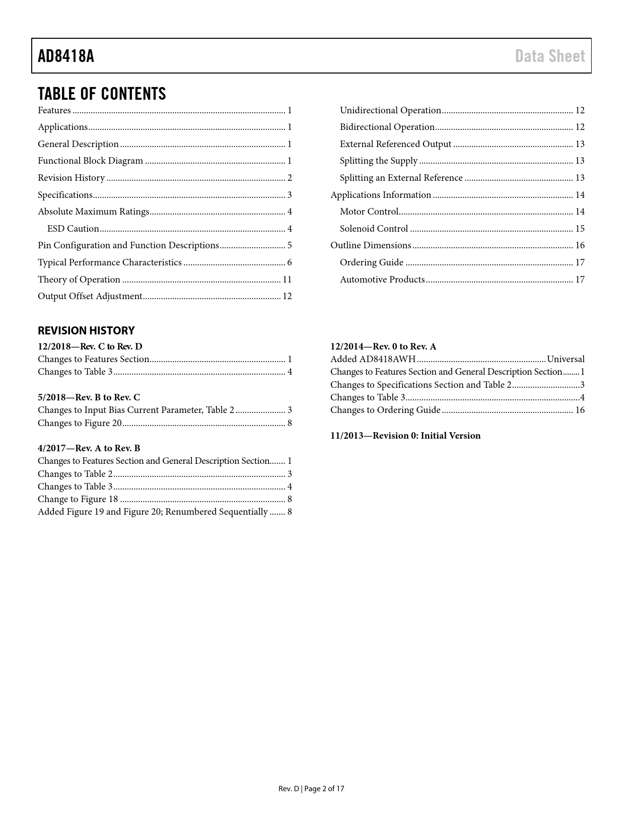 link to page 1 link to page 1 link to page 1 link to page 1 link to page 2 link to page 3 link to page 4 link to page 4 link to page 5 link to page 6 link to page 11 link to page 12 link to page 12 link to page 12 link to page 13 link to page 13 link to page 13 link to page 14 link to page 14 link to page 15 link to page 16 link to page 17 link to page 17 AD8418AData SheetTABLE OF CONTENTS Features .. 1 Unidirectional Operation .. 12 Applications ... 1 Bidirectional Operation ... 12 General Description ... 1 External Referenced Output ... 13 Functional Block Diagram .. 1 Splitting the Supply .. 13 Revision History ... 2 Splitting an External Reference .. 13 Specifications ... 3 Applications Information .. 14 Absolute Maximum Ratings .. 4 Motor Control ... 14 ESD Caution .. 4 Solenoid Control .. 15 Pin Configuration and Function Descriptions ... 5 Outline Dimensions ... 16 Typical Performance Characteristics ... 6 Ordering Guide .. 17 Theory of Operation .. 11 Automotive Products ... 17 Output Offset Adjustment ... 12 REVISION HISTORY 12/2018—Rev. C to Rev. D12/2014—Rev. 0 to Rev. A Changes to Features Section.. 1 Added AD8418AWH ... Universal Changes to Table 3 .. 4 Changes to Features Section and General Description Section .. 1 Changes to Specifications Section and Table 2 .. 3 5/2018—Rev. B to Rev. C Changes to Table 3 ... 4 Changes to Input Bias Current Parameter, Table 2 .. 3 Changes to Ordering Guide .. 16 Changes to Figure 20 .. 8 11/2013—Revision 0: Initial Version4/2017—Rev. A to Rev. B Changes to Features Section and General Description Section ... 1 Changes to Table 2 .. 3 Changes to Table 3 .. 4 Change to Figure 18 ... 8 Added Figure 19 and Figure 20; Renumbered Sequentially ... 8 Rev. D | Page 2 of 17 Document Outline FEATURES APPLICATIONS GENERAL DESCRIPTION FUNCTIONAL BLOCK DIAGRAM TABLE OF CONTENTS REVISION HISTORY SPECIFICATIONS ABSOLUTE MAXIMUM RATINGS ESD CAUTION PIN CONFIGURATION AND FUNCTION DESCRIPTIONS TYPICAL PERFORMANCE CHARACTERISTICS THEORY OF OPERATION OUTPUT OFFSET ADJUSTMENT UNIDIRECTIONAL OPERATION Ground Referenced Output Mode VS Referenced Output Mode BIDIRECTIONAL OPERATION EXTERNAL REFERENCED OUTPUT SPLITTING THE SUPPLY SPLITTING AN EXTERNAL REFERENCE APPLICATIONS INFORMATION MOTOR CONTROL 3-Phase Motor Control H-Bridge Motor Control SOLENOID CONTROL High-Side Current Sense with a Low-Side Switch High-Side Current Sense with a High-Side Switch High Rail Current Sensing OUTLINE DIMENSIONS ORDERING GUIDE AUTOMOTIVE PRODUCTS