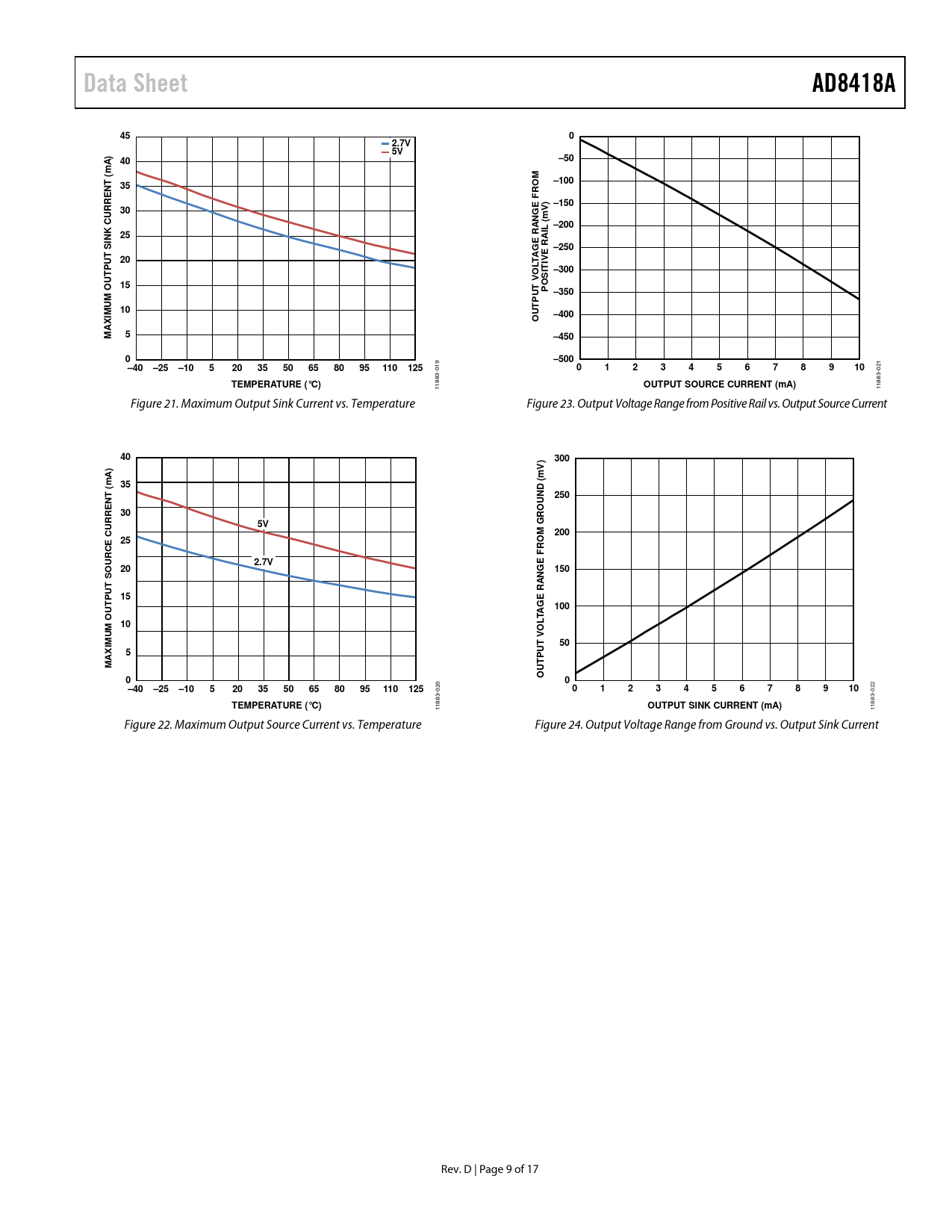 Data Sheet. AD8418A. 2.7V. –50. mA) (. –100. RO F. –150. (m –200. RANG. INK CURRE. –250. IVE R. T –300. T V U. PO –350. –400. AX M. –450. –500. –40. –25. –10. 110. 125