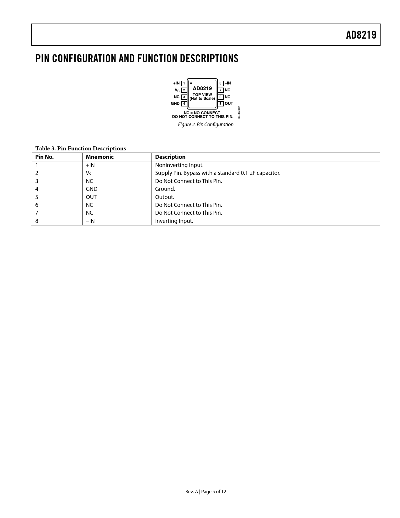 AD8219PIN CONFIGURATION AND FUNCTION DESCRIPTIONS+IN18–INVAD8219S27NCTOP VIEWNC36NC(Not to Scale)GND45OUT 2 00 NC = NO CONNECT. 5- 41 DO NOT CONNECT TO THIS PIN. 09 Figure 2. Pin Configuration Table 3. Pin Function Descriptions Pin No.MnemonicDescription 1 +IN Noninverting Input. 2 VS Supply Pin. Bypass with a standard 0.1 μF capacitor. 3 NC Do Not Connect to This Pin. 4 GND Ground. 5 OUT Output. 6 NC Do Not Connect to This Pin. 7 NC Do Not Connect to This Pin. 8 −IN Inverting Input. Rev. A | Page 5 of 12 Document Outline FEATURES APPLICATIONS GENERAL DESCRIPTION FUNCTIONAL BLOCK DIAGRAM TABLE OF CONTENTS REVISION HISTORY SPECIFICATIONS ABSOLUTE MAXIMUM RATINGS ESD CAUTION PIN CONFIGURATION AND FUNCTION DESCRIPTIONS TYPICAL PERFORMANCE CHARACTERISTICS THEORY OF OPERATION AMPLIFIER CORE SUPPLY CONNECTIONS OUTPUT CLAMPING OUTPUT LINEARITY APPLICATIONS INFORMATION HIGH-SIDE CURRENT SENSING MOTOR CONTROL CURRENT SENSING OUTLINE DIMENSIONS ORDERING GUIDE