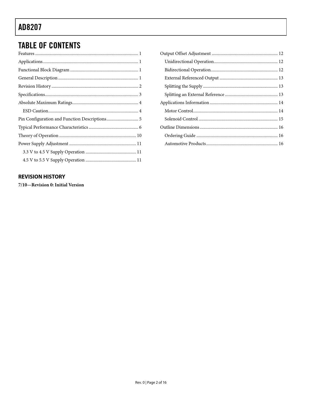 页数 / 页16 / 2 — AD8207. TABLE OF CONTENTS. REVISION HISTORY. 7/10—Revision 0: Initial …
