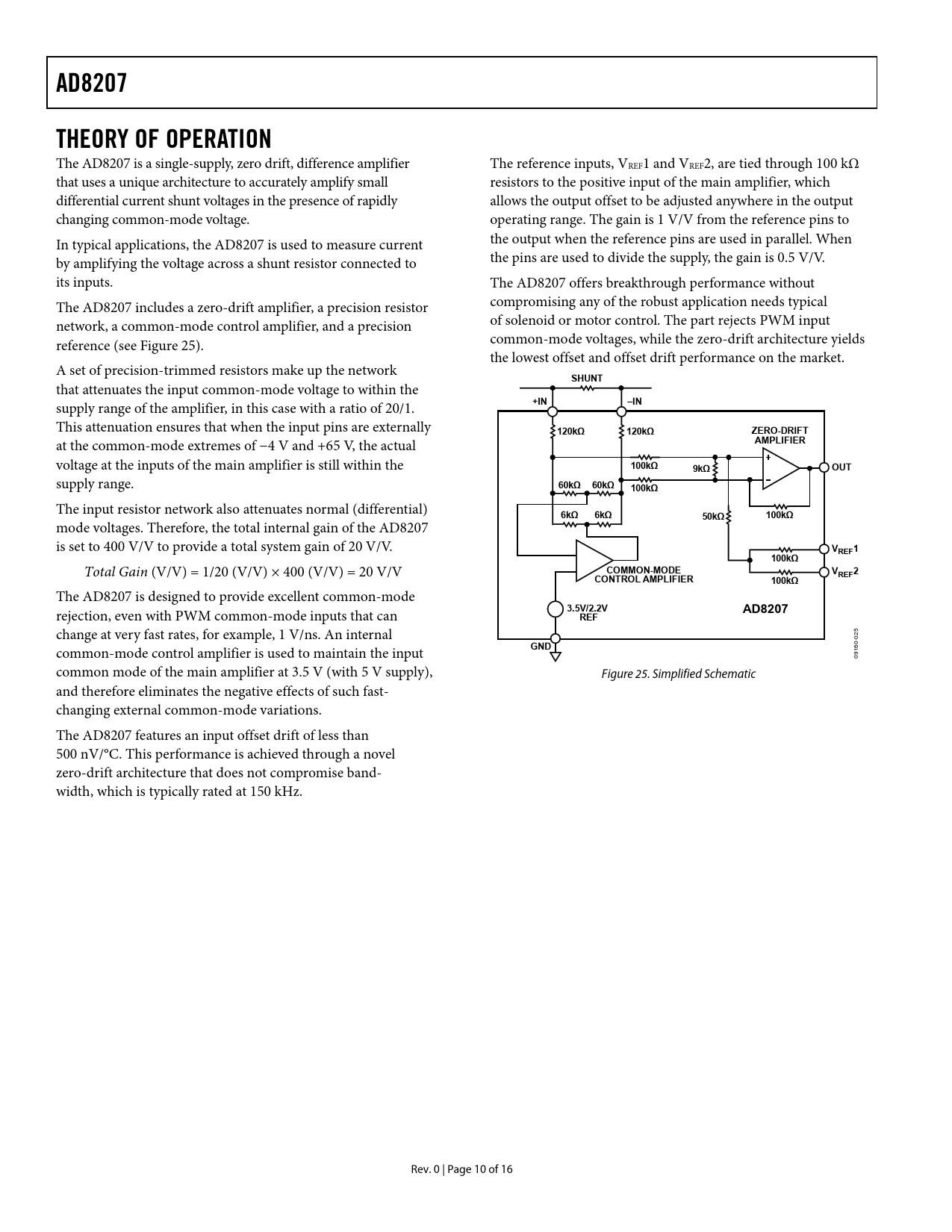 AD8207 THEORY OF OPERATION SHUNT +IN –IN 120kΩ ZERO-DRIFT AMPLIFIER 100kΩ 9kΩ OUT 60kΩ 6kΩ 50kΩ VREF1 COMMON-MODE VREF2
