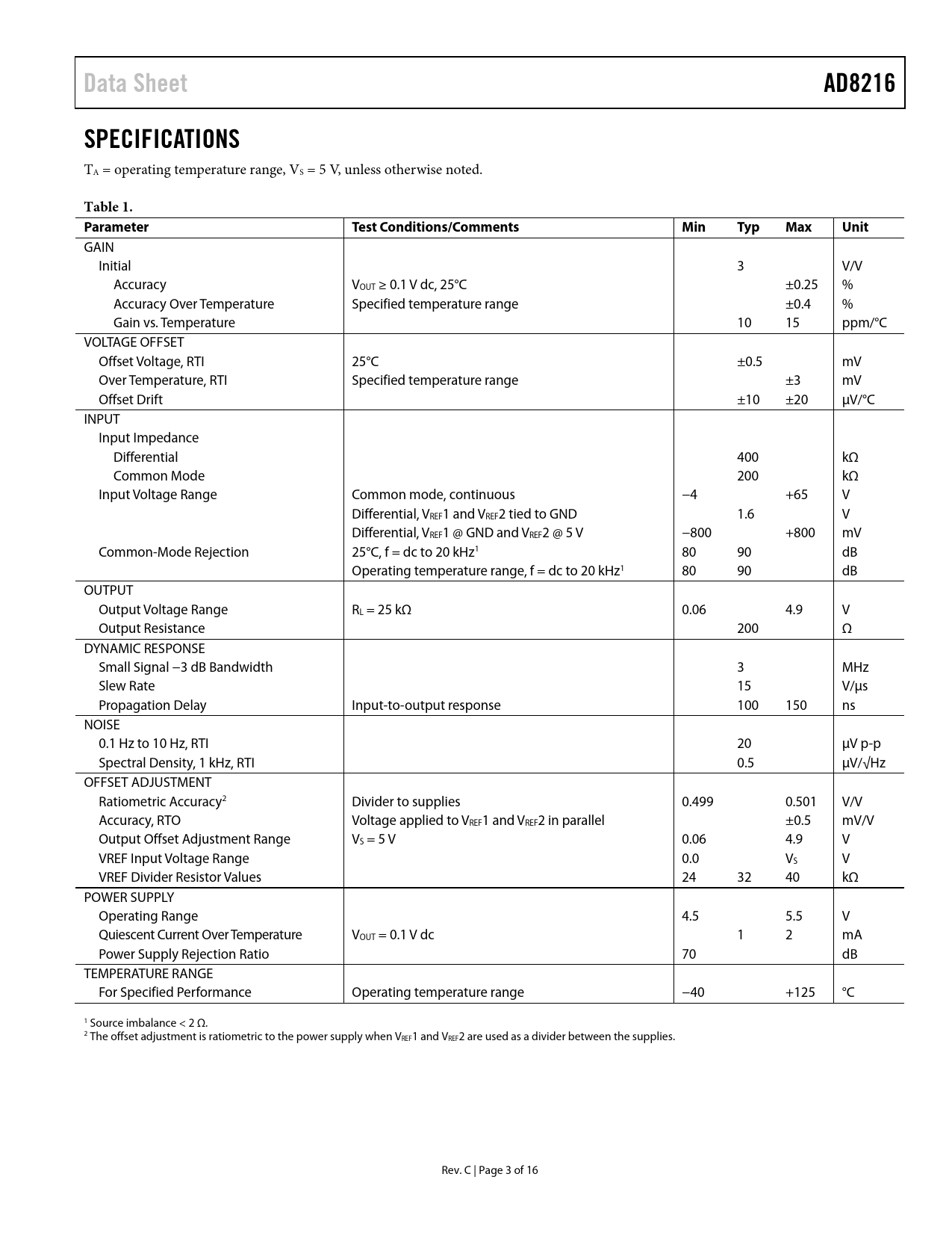 Data Sheet AD8216 SPECIFICATIONS Table 1 Parameter Test Conditions/Comments Min Typ Max Unit