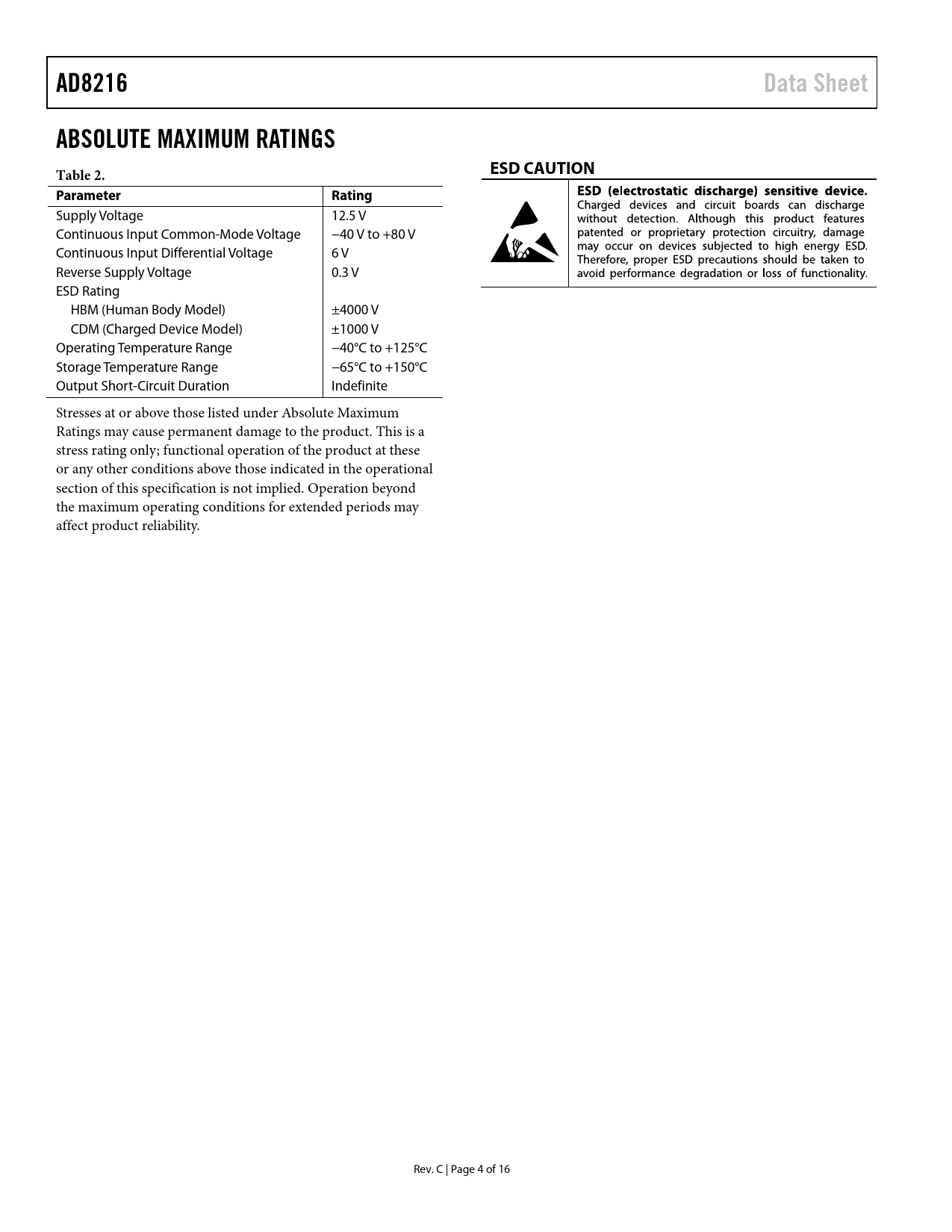 AD8216 Data Sheet ABSOLUTE MAXIMUM RATINGS Table 2 ESD CAUTION Parameter Rating