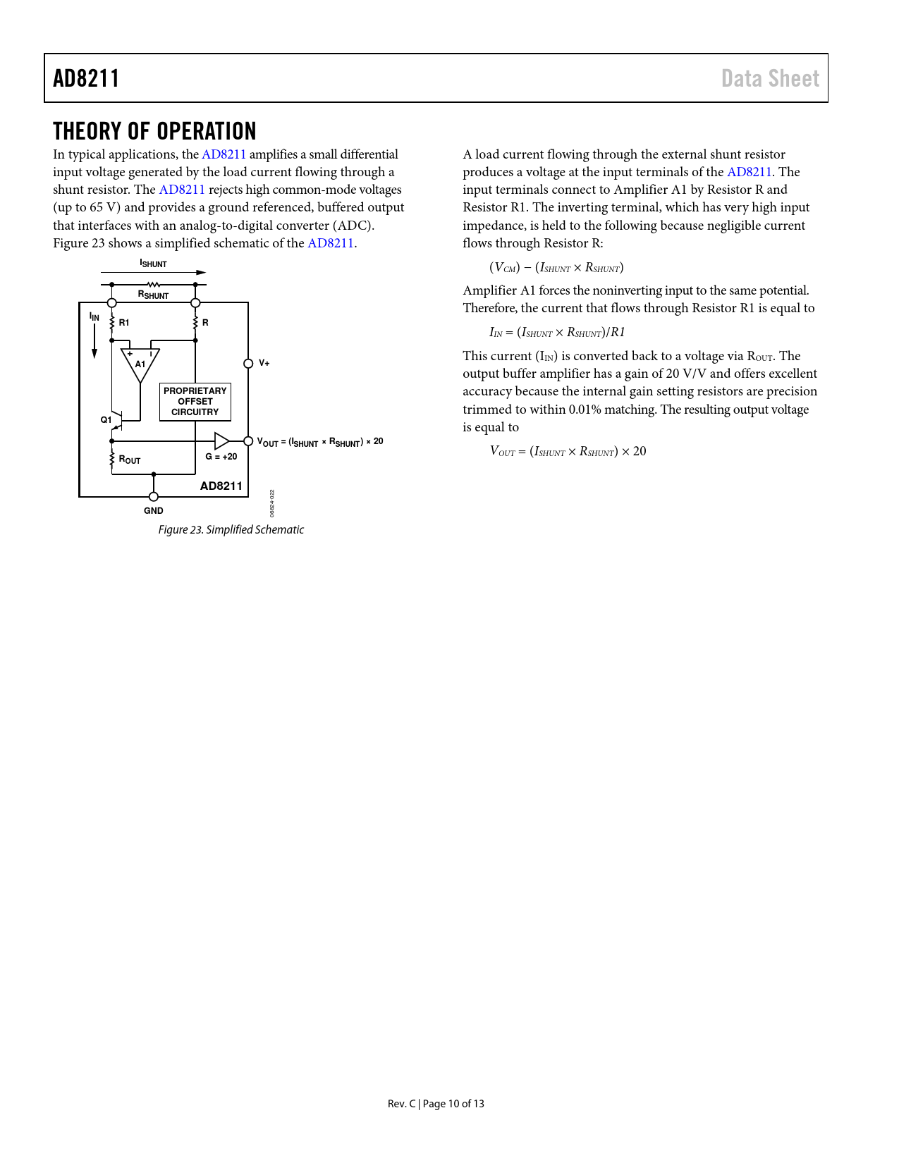 AD8211. Data Sheet. THEORY OF OPERATION. ISHUNT. SHUNT. IIN. PROPRIETARY. OFFSET. CIRCUITRY. VOUT = (ISHUNT × RSHUNT) × 20. G = +20. ROUT. GND