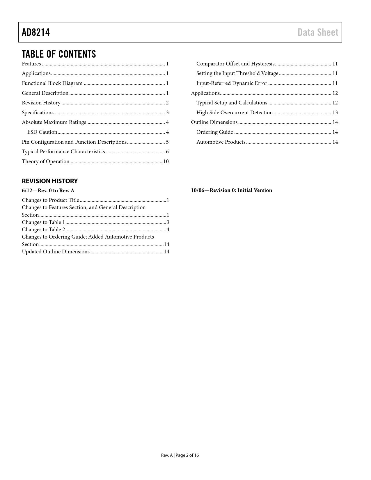 link to page 1 link to page 1 link to page 1 link to page 1 link to page 2 link to page 3 link to page 4 link to page 4 link to page 5 link to page 6 link to page 10 link to page 11 link to page 11 link to page 11 link to page 12 link to page 12 link to page 13 link to page 14 link to page 14 link to page 14 AD8214Data SheetTABLE OF CONTENTS Features .. 1 Comparator Offset and Hysteresis ... 11 Applications ... 1 Setting the Input Threshold Voltage .. 11 Functional Block Diagram .. 1 Input-Referred Dynamic Error .. 11 General Description ... 1 Applications ... 12 Revision History ... 2 Typical Setup and Calculations .. 12 Specifications ... 3 High Side Overcurrent Detection .. 13 Absolute Maximum Ratings .. 4 Outline Dimensions ... 14 ESD Caution .. 4 Ordering Guide .. 14 Pin Configuration and Function Descriptions ... 5 Automotive Products ... 14 Typical Performance Characteristics ... 6 Theory of Operation .. 10 REVISION HISTORY 6/12—Rev. 0 to Rev. A10/06—Revision 0: Initial Version Changes to Product Title .. 1 Changes to Features Section, and General Description Section ... 1 Changes to Table 1 ... 3 Changes to Table 2 ... 4 Changes to Ordering Guide; Added Automotive Products Section ... 14 Updated Outline Dimensions .. 14 Rev. A | Page 2 of 16 Document Outline Features Applications Functional Block Diagram General Description Revision History Specifications Absolute Maximum Ratings ESD Caution Pin Configuration and Function Descriptions Typical Performance Characteristics Theory of Operation Comparator Offset and Hysteresis Setting the Input Threshold Voltage Input-Referred Dynamic Error Applications Typical Setup and Calculations High Side Overcurrent Detection Outline Dimensions Ordering Guide Automotive Products