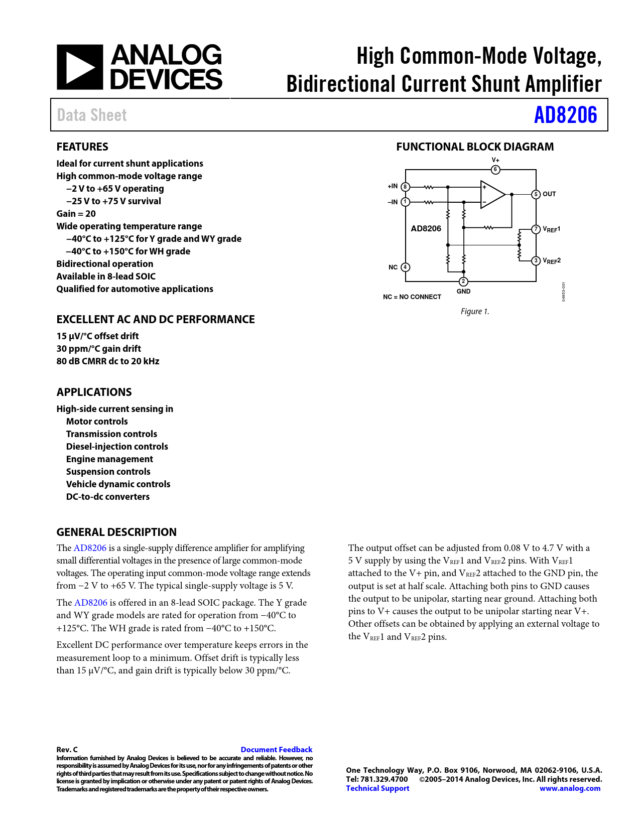 EXCELLENT AC AND DC PERFORMANCE 15 µV/°C offset drift 30 ppm/°C gain drift 80 dB CMRR dc to 20 kHz APPLICATIONS High-side current sensing in Motor controls Transmission controls Diesel-injection controls Engine management Suspension controls Vehicle dynamic controls DC-to-dc converters GENERAL DESCRIPTION
