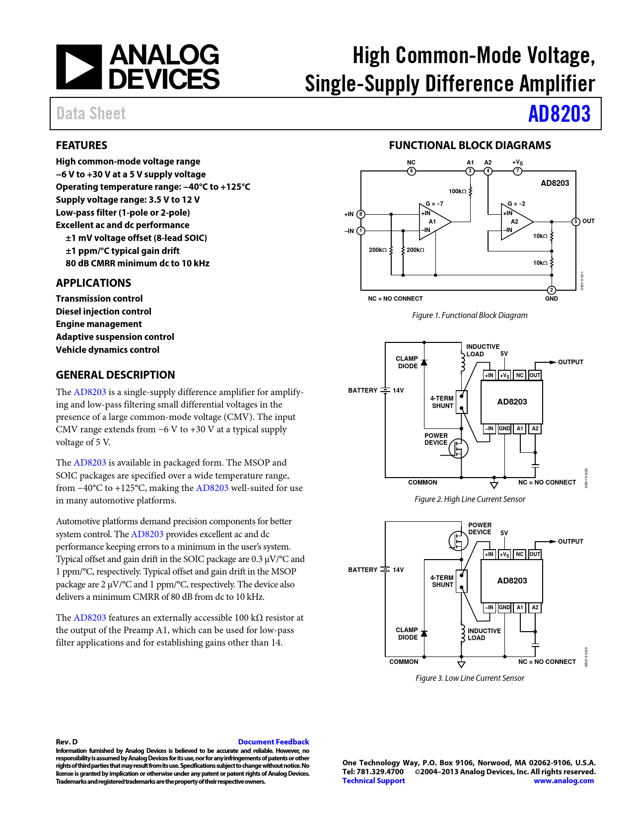 High Common-Mode Voltage,. Single-Supply Difference Amplifier. Data Sheet. AD8203. FEATURES. FUNCTIONAL BLOCK DIAGRAMS