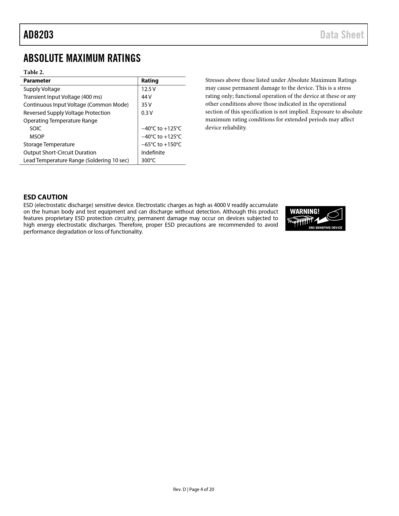 AD8203. Data Sheet. ABSOLUTE MAXIMUM RATINGS Table 2. Parameter. Rating. ESD CAUTION