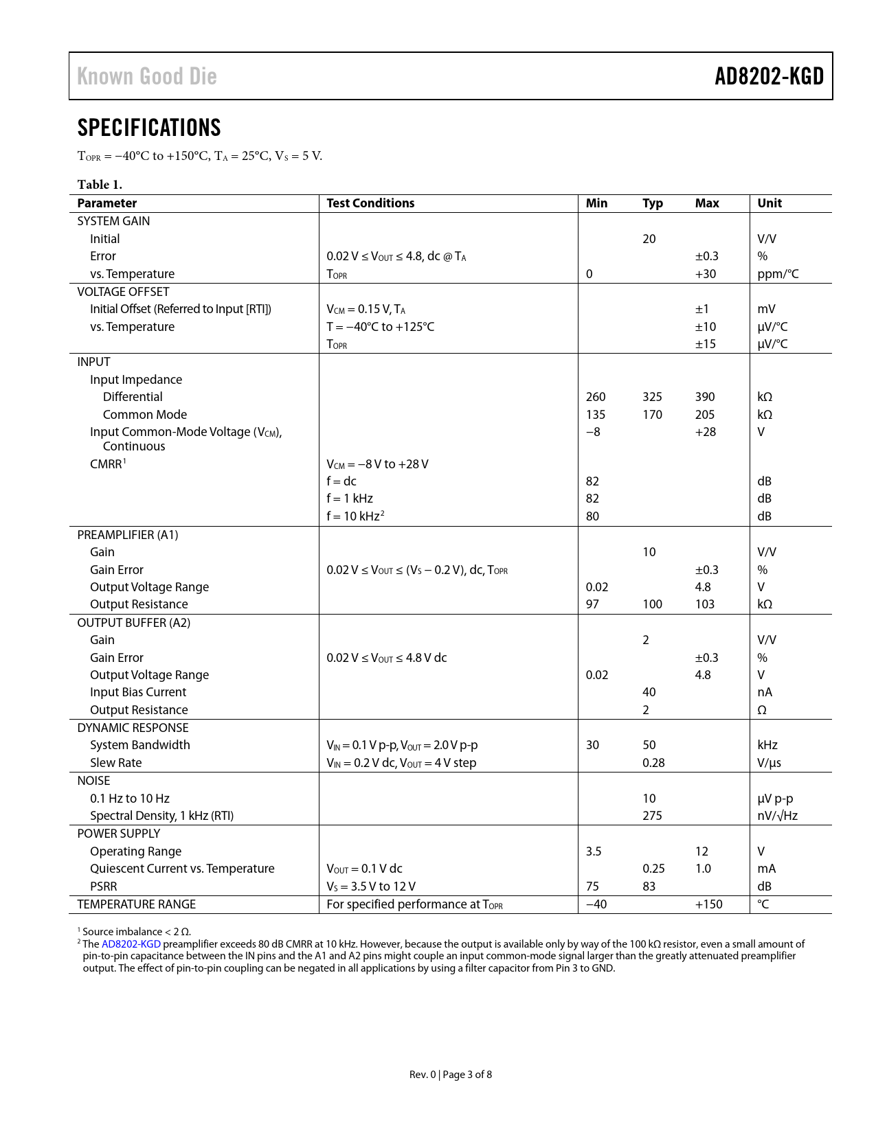 Known Good Die AD8202-KGD SPECIFICATIONS Table 1 Parameter Test Conditions Min Typ Max Unit