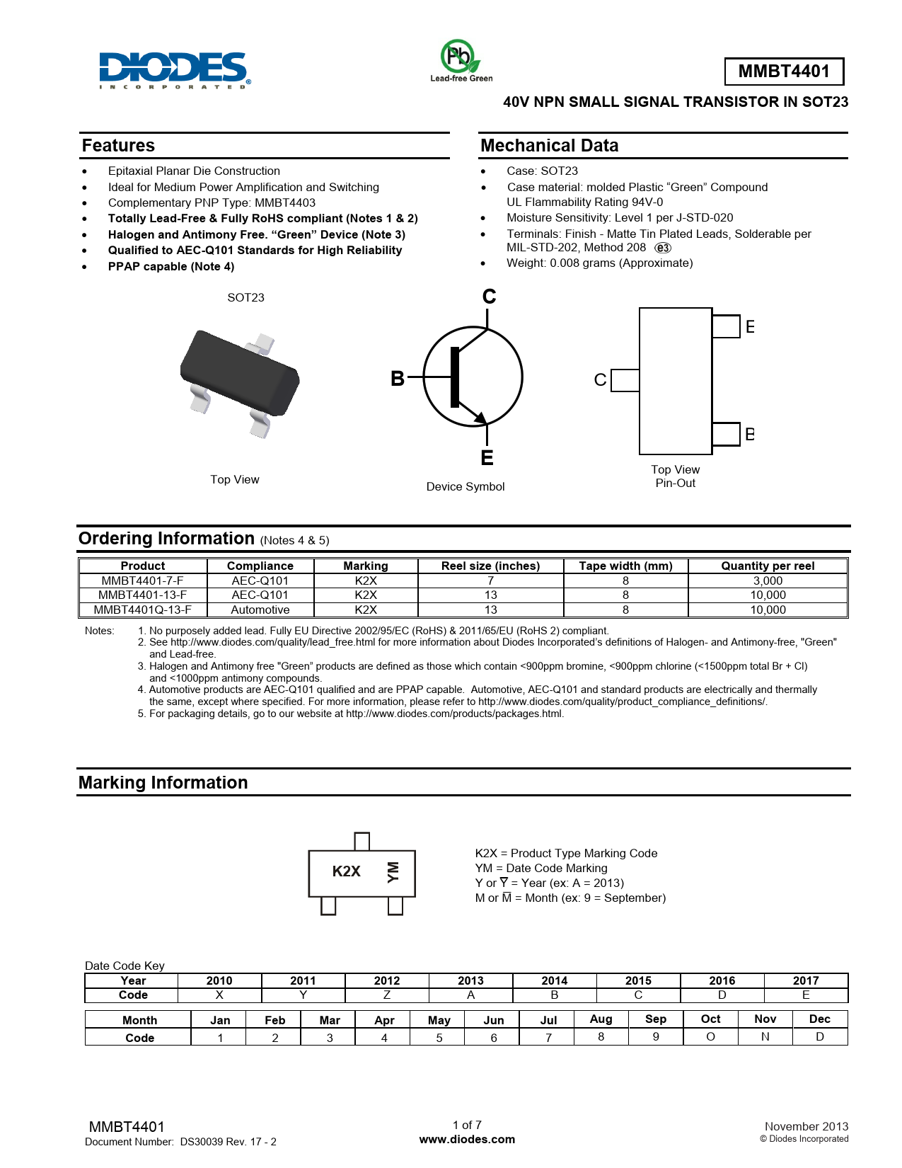 MMBT4401-7-F AEC-Q101 K2X 7 8 3,000 MMBT4401-13-F AEC-Q101 K2X 13 8 10,000 MMBT4401Q-13-F Automotive K2X 13 8 10,000 Notes: 1. No purposely added lead. Fully EU Directive 2002/95/EC (RoHS) & 2011/65/EU (RoHS 2) compliant. 2. See http://www.diodes.com/quality/lead_free.html for more information about Diodes Incorporated’s definitions of Halogen- and Antimony-free, "Green" and Lead-free. 3. Halogen and Antimony free "Green” products are defined as those which contain <900ppm bromine, <900ppm chlorine (<1500ppm total Br + Cl) and <1000ppm antimony compounds. 4. Automotive products are AEC-Q101 qualified and are PPAP capable. Automotive, AEC-Q101 and standard products are electrically and thermally the same, except where specified. For more information, please refer to http://www.diodes.com/quality/product_compliance_definitions/. 5. For packaging details, go to our website at http://www.diodes.com/products/packages.html.