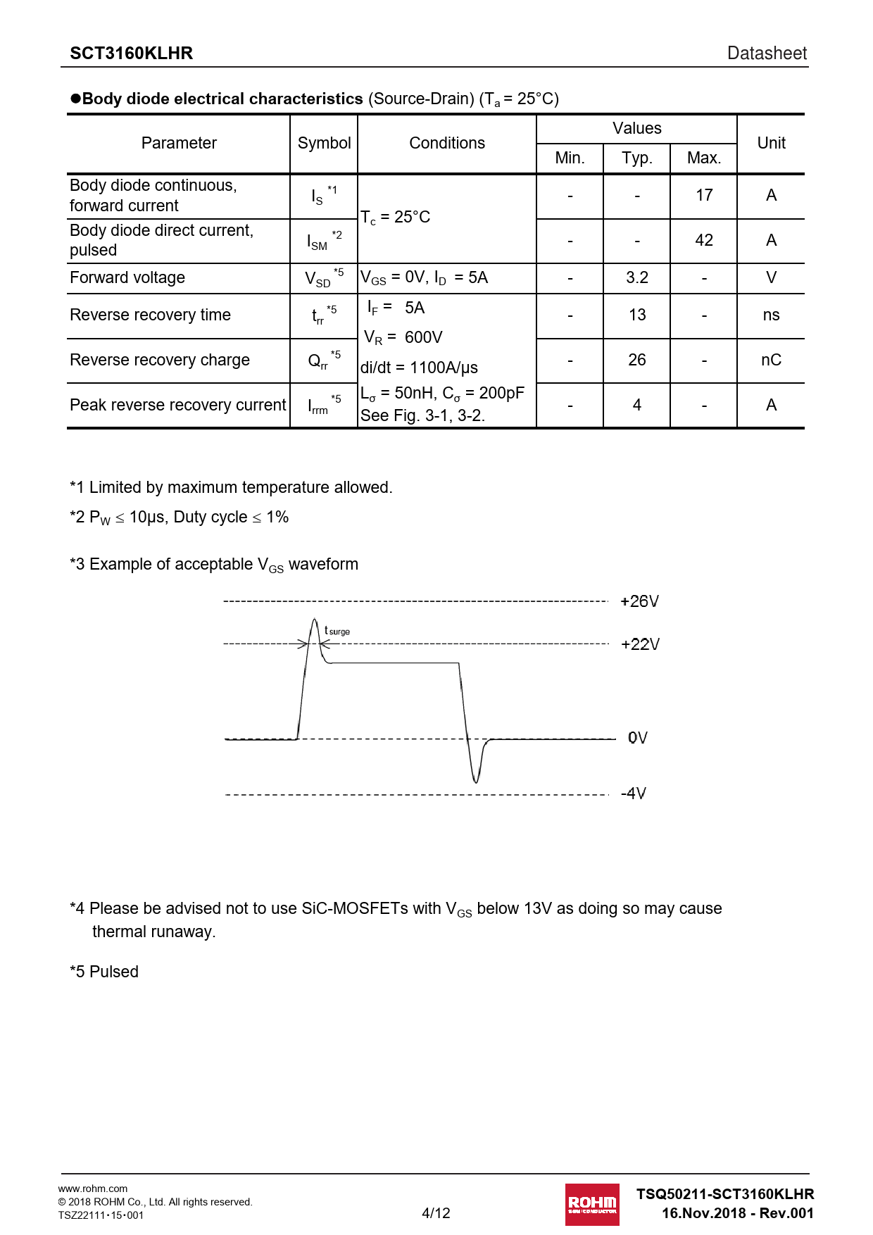 (Source-Drain) (Ta = 25°C) Values Parameter Symbol Conditions Unit Min. Typ. Max. Body diode continuous, - - 17 A forward current IS *1 Tc = 25°C Body diode direct current, ISM *2 - - 42 A pulsed Forward voltage V *5 SD VGS = 0V, ID = 5A - 3.2 - V *5 IF = 5A Reverse recovery time trr - 13 - ns VR = 600V Reverse recovery charge Q *5 rr - 26 - nC di/dt = 1100A/μs L Peak reverse recovery current I *5 σ = 50nH, Cσ = 200pF rrm - 4 - A See Fig. 3-1, 3-2. *1 Limited by maximum temperature allowed. *2 PW 10μs, Duty cycle 1% *3 Example of acceptable VGS waveform Please note especially when using driver source that VGSS_surge must be in the range of absolute maximum rating. *4 Please be advised not to use SiC-MOSFETs with VGS below 13V as doing so may cause thermal runaway. *5 Pulsed www.rohm.com
