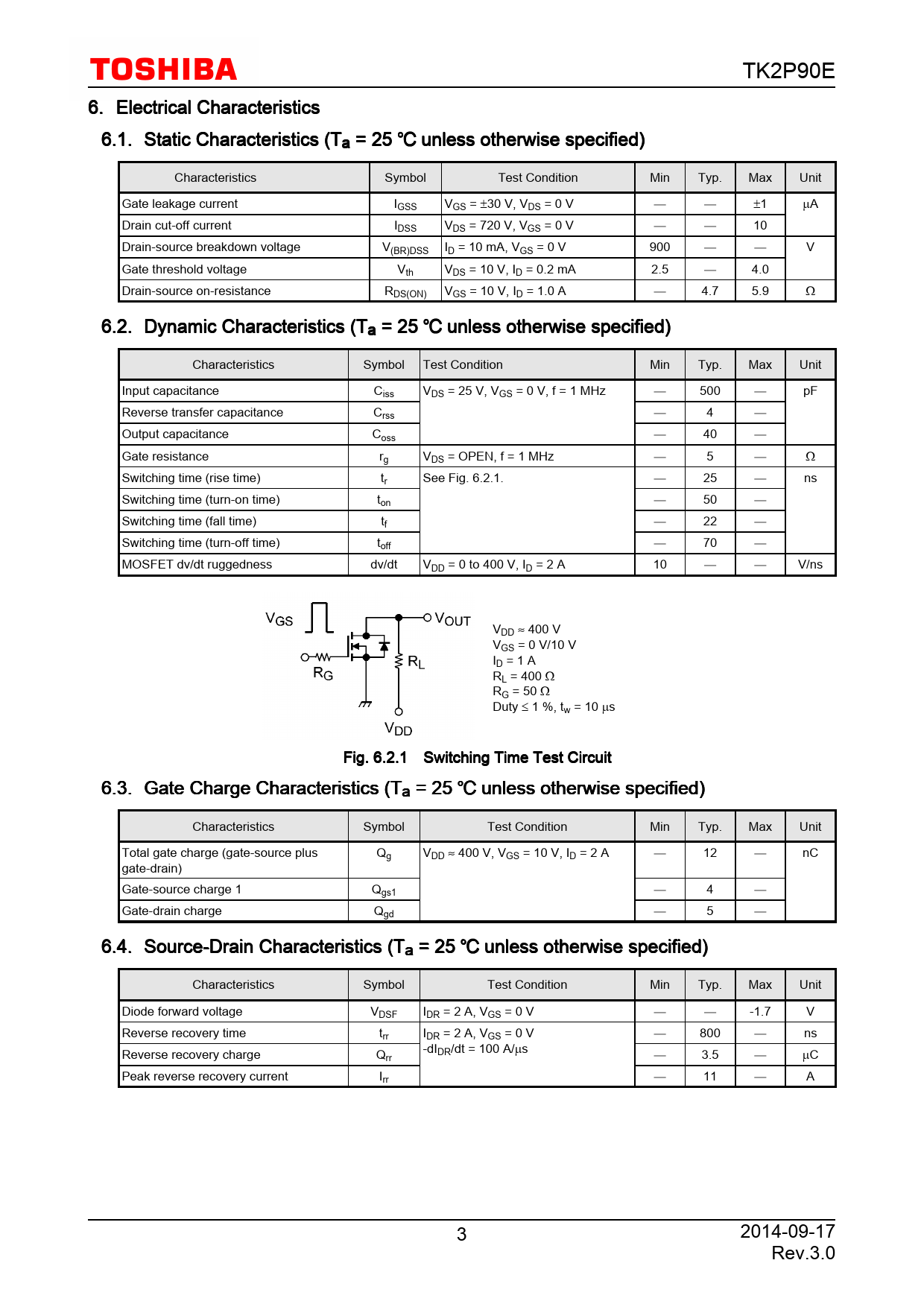 | 页数 / 页 | 9 / 3 — TK2P90E. 6. Electrical. Characteristics. 6.1. Static. Characteristics. … |