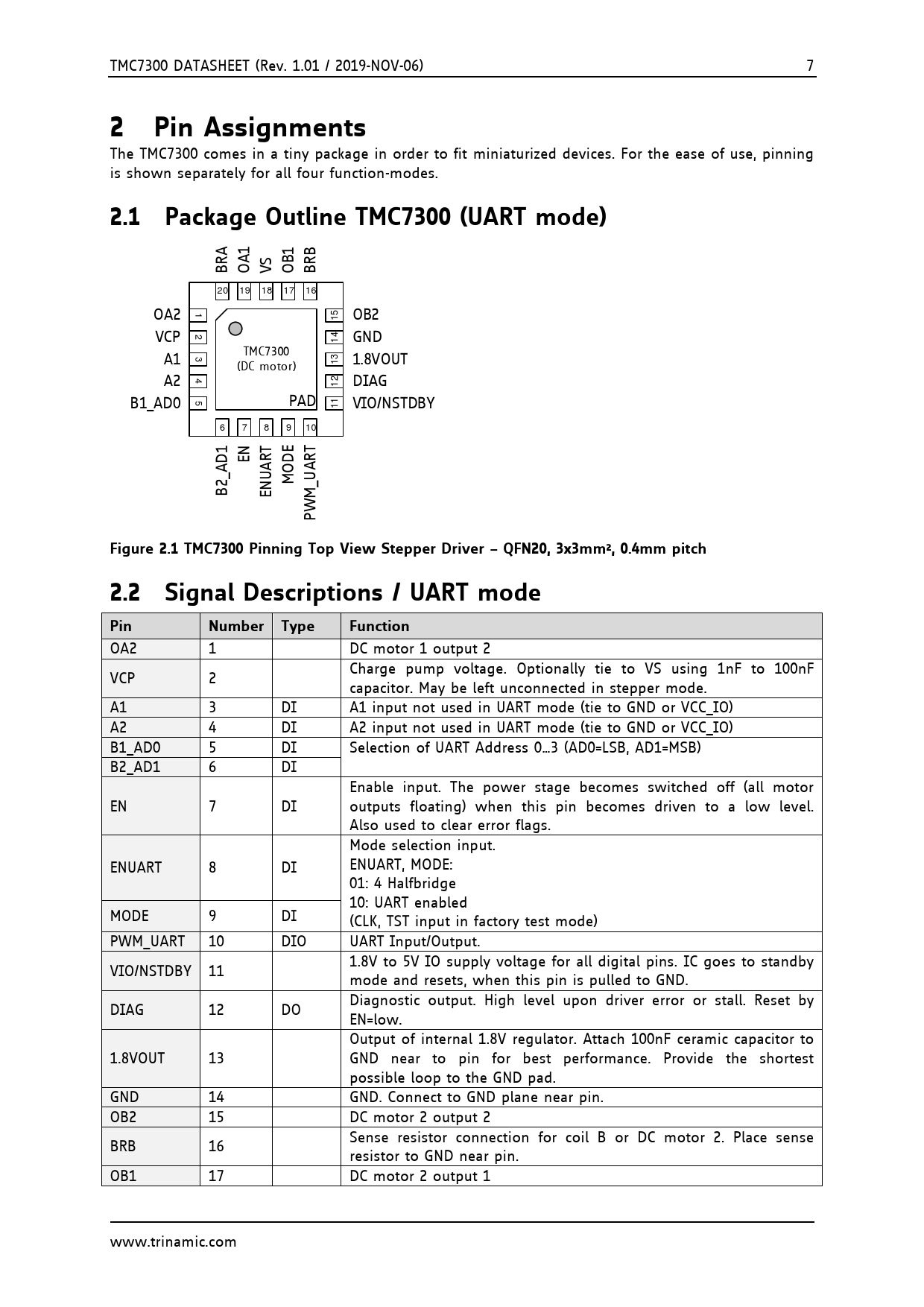 2 Pin Assignments. 2.1 Package Outline TMC7300 (UART mode)