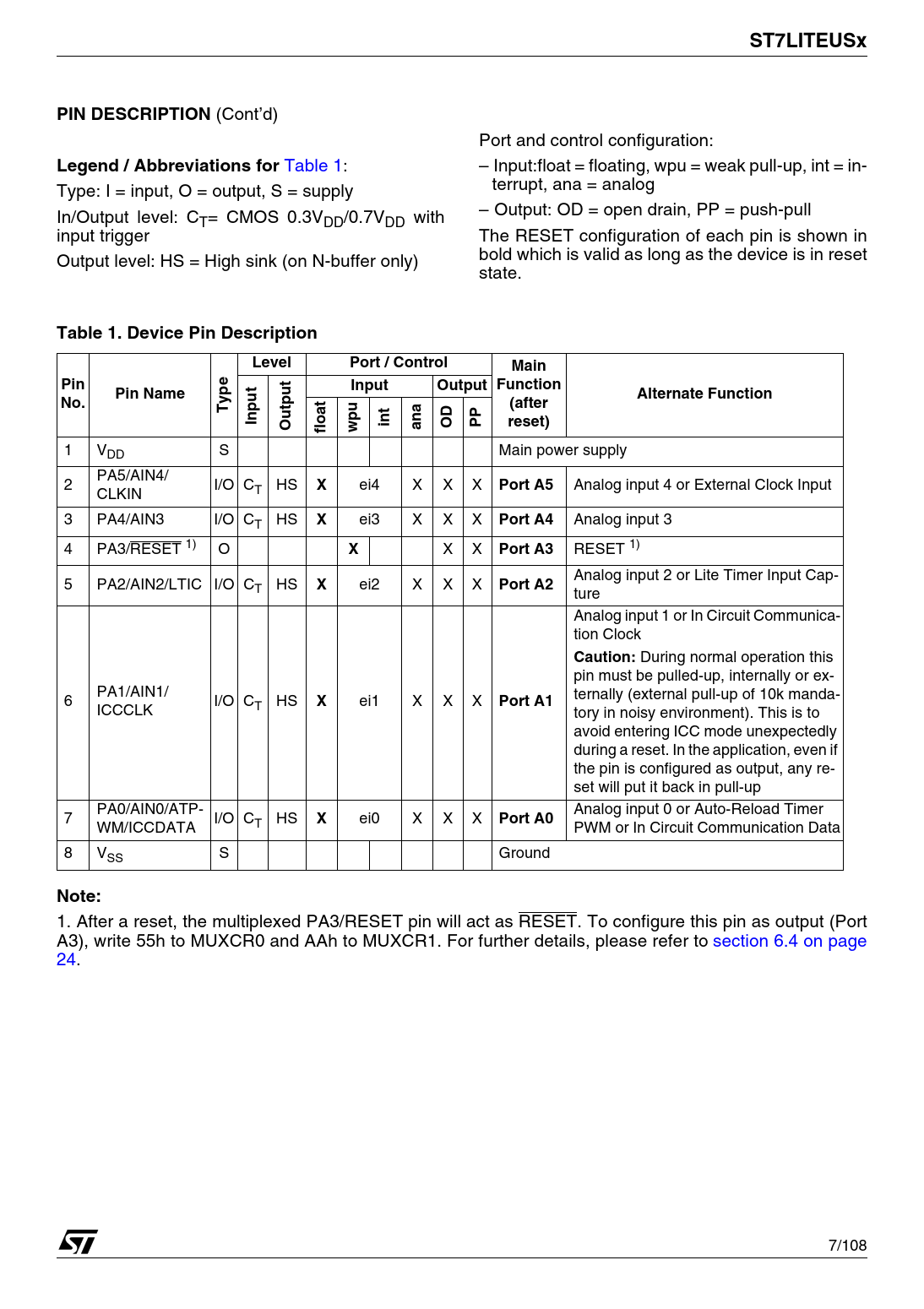 1. After a reset, the multiplexed PA3/RESET pin will act as RESET. To configure this pin as output (Port A3), write 55h to MUXCR0 and AAh to MUXCR1. For further details, please refer to section 6.4 on page 24. 7/108 1
