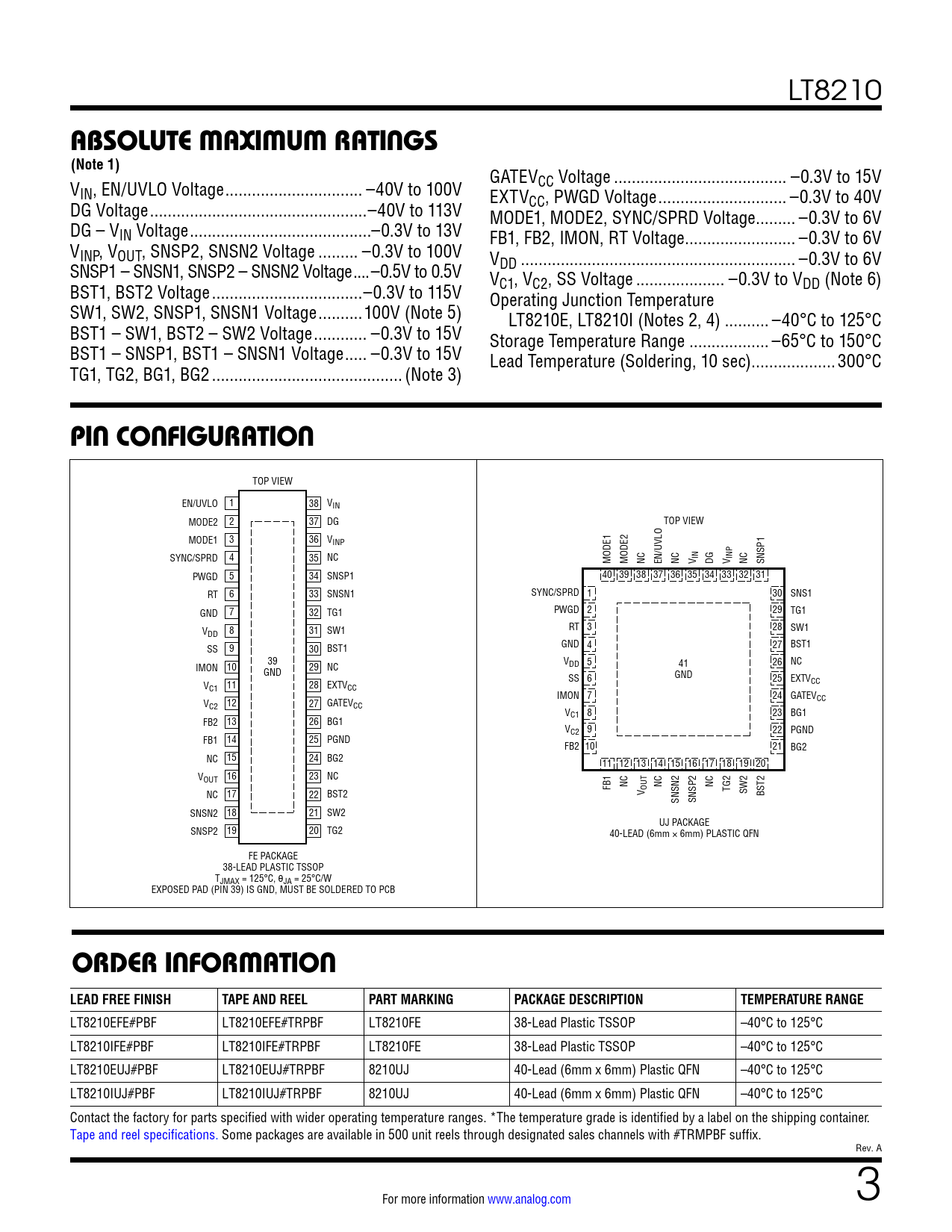 LT8210EFE#PBF LT8210EFE#TRPBF LT8210FE 38-Lead Plastic TSSOP –40°C to 125°C LT8210IFE#PBF LT8210IFE#TRPBF LT8210FE 38-Lead Plastic TSSOP –40°C to 125°C LT8210EUJ#PBF LT8210EUJ#TRPBF 8210UJ 40-Lead (6mm x 6mm) Plastic QFN –40°C to 125°C LT8210IUJ#PBF LT8210IUJ#TRPBF 8210UJ 40-Lead (6mm x 6mm) Plastic QFN –40°C to 125°C Contact the factory for parts specified with wider operating temperature ranges. *The temperature grade is identified by a label on the shipping container. Tape and reel specifications. Some packages are available in 500 unit reels through designated sales channels with #TRMPBF suffix. Rev. A For more information www.analog.com 3 Document Outline Features Applications Typical Application Description Table of Contents Absolute Maximum Ratings Pin Configuration Order Information Electrical Characteristics Typical Performance Characteristics Pin Functions Block Diagram Operation Applications Information Typical Applications Revision History Typical Application Related Parts