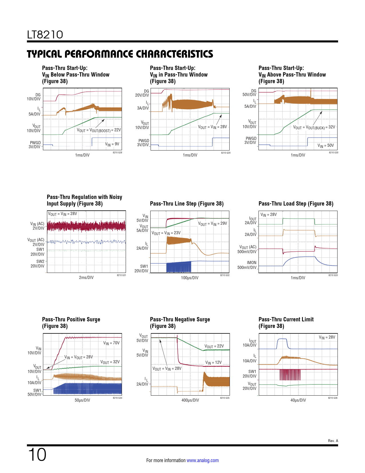 VOUT = VIN = 28V V V IN IN = 28V 5V/DIV IOUT VIN (AC) VOUT = VIN = 29V 2A/DIV 2V/DIV VOUT 5A/DIV I V L OUT = VIN = 23V 2A/DIV VOUT (AC) 2V/DIV IL SW1 2A/DIV VOUT (AC) 20V/DIV 500mV/DIV SW2 IMON 20V/DIV SW1 500mV/DIV 20V/DIV 2ms/DIV 8210 G31 100µs/DIV 8210 G32 1ms/DIV 8210 G33