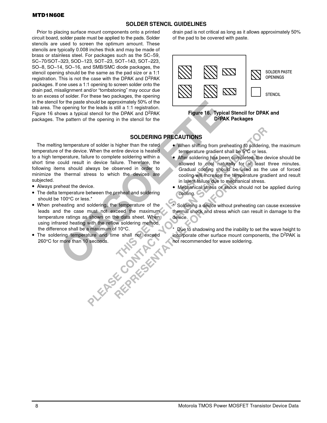 MTD1N60E SOLDER STENCIL GUIDELINES Prior to placing surface mount components onto a printed drain pad is not critical as long as it allows approximately 50% circuit board, solder paste must be applied to the pads. Solder of the pad to be covered with paste. stencils are used to screen the optimum amount. These stencils are typically 0.008 inches thick and may be made of brass or stainless steel. For packages such as the SC−59, SC−70/SOT−323, SOD−123, SOT−23, SOT−143, SOT−223, SO−8, SO−14, SO−16, and SMB/SMC diode packages, the stencil opening should be the same as the pad size or a 1:1 SOLDER PASTE ÇÇÇ ÇÇÇ ÇÇ ÇÇ registration. This is not the case with the DPAK and D2PAK OPENINGS ÇÇÇ ÇÇÇ ÇÇ ÇÇ packages. If one uses a 1:1 opening to screen solder onto the drain pad, misalignment and/or “tombstoning” may occur due ÇÇÇ ÇÇÇ ÇÇ to an excess of solder. For these two packages, the opening STENCIL ÇÇÇ ÇÇÇ ÇÇ in the stencil for the paste should be approximately 50% of the tab area. The opening for the leads is still a 1:1 registration. Figure 16 shows a typical stencil for the DPAK and D2PAK Figure 16. Typical Stencil for DPAK and packages. The pattern of the opening in the stencil for the D2PAK PackagesSOLDERING PRECAUTIONS The melting temperature of solder is higher than the rated • When shifting from preheating to soldering, the maximum temperature of the device. When the entire device is heated temperature gradient shall be 5°C or less. to a high temperature, failure to complete soldering within a • After soldering has been completed, the device should be short time could result in device failure. Therefore, the allowed to cool naturally for at least three minutes. following items should always be observed in order to Gradual cooling should be used as the use of forced minimize the thermal stress to which the devices are cooling will increase the temperature gradient and result subjected. in latent failure due to mechanical stress. • Always preheat the device. • Mechanical stress or shock should not be applied during • The delta temperature between the preheat and soldering cooling. should be 100°C or less.* • When preheating and soldering, the temperature of the * Soldering a device without preheating can cause excessive leads and the case must not exceed the maximum thermal shock and stress which can result in damage to the temperature ratings as shown on the data sheet. When device. using infrared heating with the reflow soldering method, the difference shall be a maximum of 10°C. * Due to shadowing and the inability to set the wave height to • The soldering temperature and time shall not exceed incorporate other surface mount components, the D2PAK is 260°C for more than 10 seconds. not recommended for wave soldering. 8 Motorola TMOS Power MOSFET Transistor Device Data