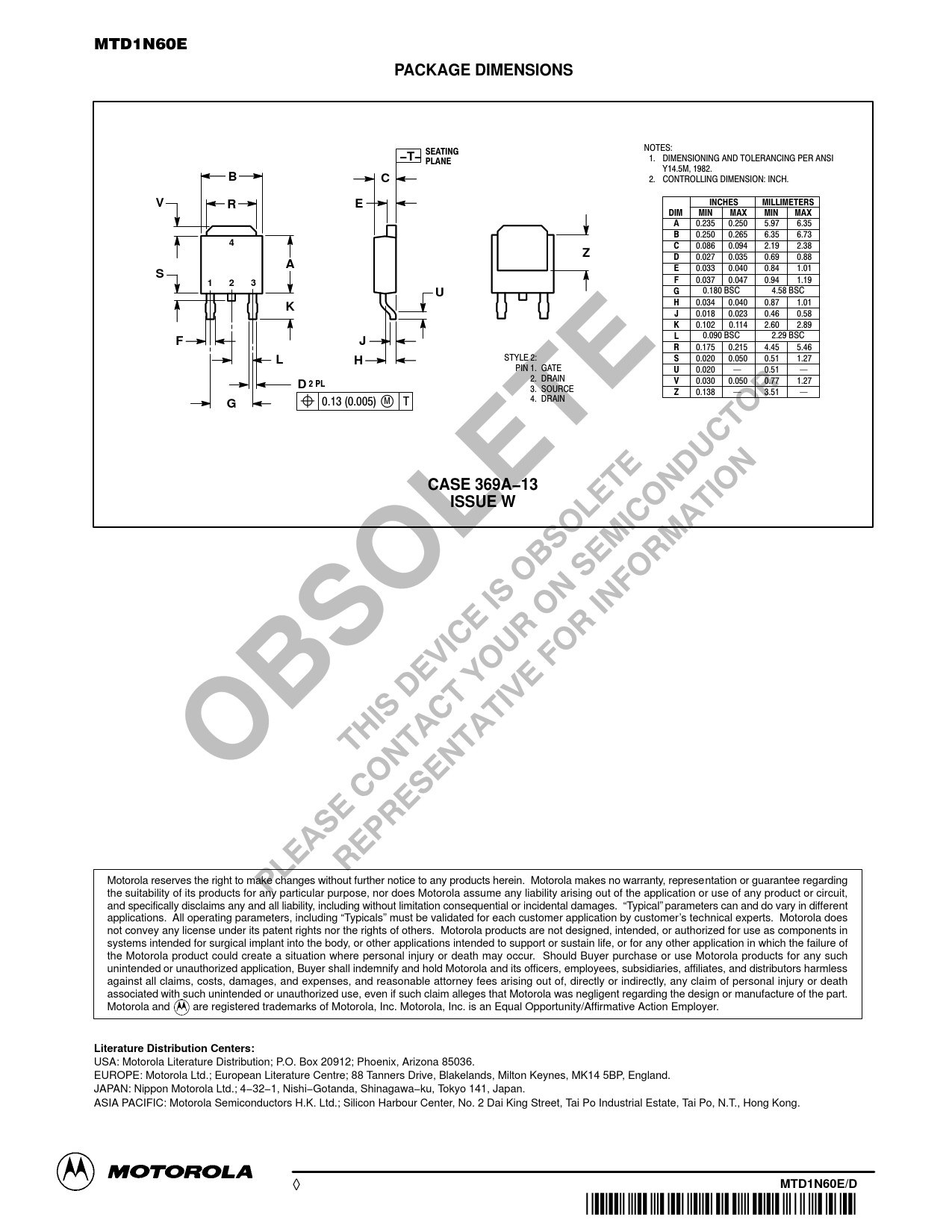 MTD1N60E PACKAGE DIMENSIONS NOTES: SEATING −T− 1. DIMENSIONING AND TOLERANCING PER ANSI PLANE Y14.5M, 1982. BC 2. CONTROLLING DIMENSION: INCH. VRE INCHES MILLIMETERS DIM MIN MAX MIN MAX A 0.235 0.250 5.97 6.35 B 0.250 0.265 6.35 6.73 4 C 0.086 0.094 2.19 2.38 Z D 0.027 0.035 0.69 0.88 A E 0.033 0.040 0.84 1.01 S F 0.037 0.047 0.94 1.19 123U G 0.180 BSC 4.58 BSC H 0.034 0.040 0.87 1.01 K J 0.018 0.023 0.46 0.58 K 0.102 0.114 2.60 2.89 L 0.090 BSC 2.29 BSC FJ R 0.175 0.215 4.45 5.46 L STYLE 2: S 0.020 0.050 0.51 1.27 H PIN 1. GATE U 0.020 0.51 2. DRAIN V 0.030 0.050 0.77 1.27 D 2 PL 3. SOURCE Z 0.138 3.51 G 0.13 (0.005) M T 4. DRAIN CASE 369A−13ISSUE W Motorola reserves the right to make changes without further notice to any products herein. Motorola makes no warranty, representation or guarantee regarding the suitability of its products for any particular purpose, nor does Motorola assume any liability arising out of the application or use of any product or circuit, and specifically disclaims any and all liability, including without limitation consequential or incidental damages. “Typical” parameters can and do vary in different applications. All operating parameters, including “Typicals” must be validated for each customer application by customer’s technical experts. Motorola does not convey any license under its patent rights nor the rights of others. Motorola products are not designed, intended, or authorized for use as components in systems intended for surgical implant into the body, or other applications intended to support or sustain life, or for any other application in which the failure of the Motorola product could create a situation where personal injury or death may occur. Should Buyer purchase or use Motorola products for any such unintended or unauthorized application, Buyer shall indemnify and hold Motorola and its officers, employees, subsidiaries, affiliates, and distributors harmless against all claims, costs, damages, and expenses, and reasonable attorney fees arising out of, directly or indirectly, any claim of personal injury or death associated with such unintended or unauthorized use, even if such claim alleges that Motorola was negligent regarding the design or manufacture of the part. Motorola and are registered trademarks of Motorola, Inc. Motorola, Inc. is an Equal Opportunity/Affirmative Action Employer. Literature Distribution Centers: USA: Motorola Literature Distribution; P.O. Box 20912; Phoenix, Arizona 85036. EUROPE: Motorola Ltd.; European Literature Centre; 88 Tanners Drive, Blakelands, Milton Keynes, MK14 5BP, England. JAPAN: Nippon Motorola Ltd.; 4−32−1, Nishi−Gotanda, Shinagawa−ku, Tokyo 141, Japan. ASIA PACIFIC: Motorola Semiconductors H.K. Ltd.; Silicon Harbour Center, No. 2 Dai King Street, Tai Po Industrial Estate, Tai Po, N.T., Hong Kong. 10 Motorola TMOS Power MOSFET Transistor Device Data ◊ MTD1N60E/D *MTD1N60E/D*