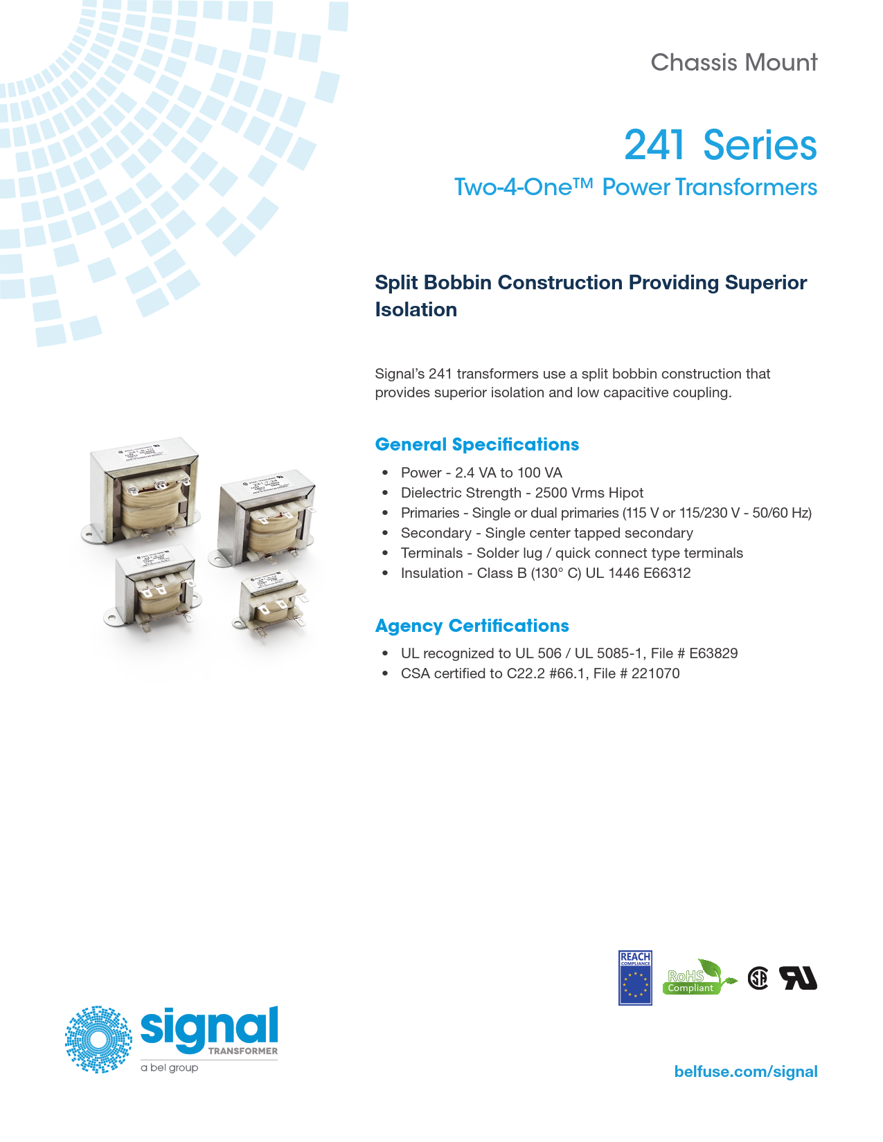 Signal’s 241 transformers use a split bobbin construction that provides superior isolation and low capacitive coupling.