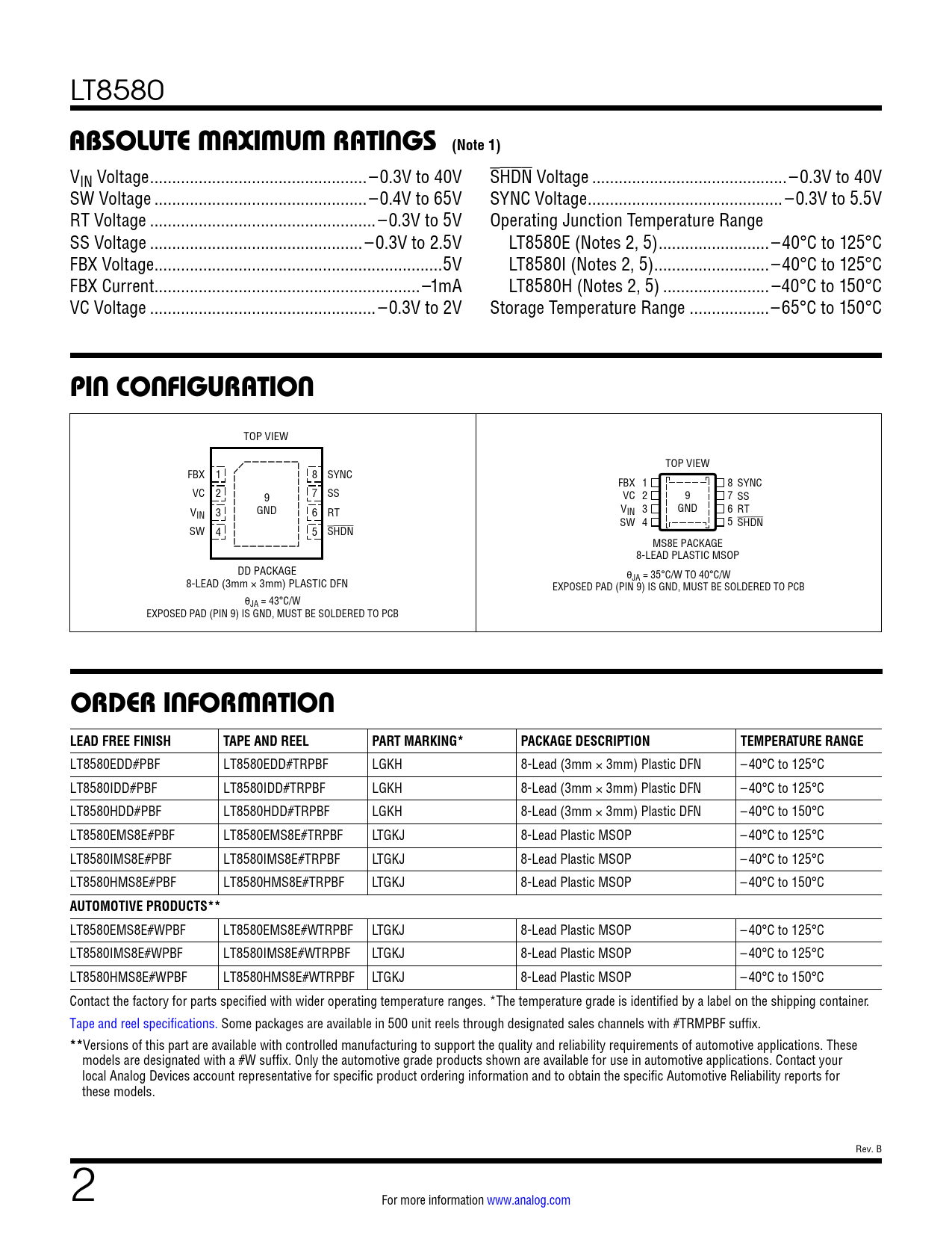 LT8580 ABSOLUTE MAXIMUM RATINGS (Note 1) VIN Voltage ...–0.3V to 40V SHDN Voltage ..–0.3V to 40V SW Voltage ..–0.4V to 65V SYNC Voltage .. –0.3V to 5.5V RT Voltage ...–0.3V to 5V Operating Junction Temperature Range SS Voltage ..–0.3V to 2.5V LT8580E (Notes 2, 5) ...–40°C to 125°C FBX Voltage ...5V LT8580I (Notes 2, 5) ..–40°C to 125°C FBX Current ..–1mA LT8580H (Notes 2, 5) .. –40°C to 150°C VC Voltage ... –0.3V to 2V Storage Temperature Range ..–65°C to 150°C PIN CONFIGURATION TOP VIEW TOP VIEW FBX 1 8 SYNC FBX 1 8 SYNC VC 2 7 9 SS VC 2 9 7 SS V VIN 3 GND 6 RT IN 3 GND 6 RT SW 4 5 SHDN SW 4 5 SHDN MS8E PACKAGE 8-LEAD PLASTIC MSOP DD PACKAGE θ 8-LEAD (3mm JA = 35°C/W TO 40°C/W × 3mm) PLASTIC DFN EXPOSED PAD (PIN 9) IS GND, MUST BE SOLDERED TO PCB θJA = 43°C/W EXPOSED PAD (PIN 9) IS GND, MUST BE SOLDERED TO PCB ORDER INFORMATION LEAD FREE FINISHTAPE AND REELPART MARKING*PACKAGE DESCRIPTIONTEMPERATURE RANGE LT8580EDD#PBF LT8580EDD#TRPBF LGKH 8-Lead (3mm × 3mm) Plastic DFN –40°C to 125°C LT8580IDD#PBF LT8580IDD#TRPBF LGKH 8-Lead (3mm × 3mm) Plastic DFN –40°C to 125°C LT8580HDD#PBF LT8580HDD#TRPBF LGKH 8-Lead (3mm × 3mm) Plastic DFN –40°C to 150°C LT8580EMS8E#PBF LT8580EMS8E#TRPBF LTGKJ 8-Lead Plastic MSOP –40°C to 125°C LT8580IMS8E#PBF LT8580IMS8E#TRPBF LTGKJ 8-Lead Plastic MSOP –40°C to 125°C LT8580HMS8E#PBF LT8580HMS8E#TRPBF LTGKJ 8-Lead Plastic MSOP –40°C to 150°C AUTOMOTIVE PRODUCTS** LT8580EMS8E#WPBF LT8580EMS8E#WTRPBF LTGKJ 8-Lead Plastic MSOP –40°C to 125°C LT8580IMS8E#WPBF LT8580IMS8E#WTRPBF LTGKJ 8-Lead Plastic MSOP –40°C to 125°C LT8580HMS8E#WPBF LT8580HMS8E#WTRPBF LTGKJ 8-Lead Plastic MSOP –40°C to 150°C Contact the factory for parts specified with wider operating temperature ranges. *The temperature grade is identified by a label on the shipping container. Tape and reel specifications. Some packages are available in 500 unit reels through designated sales channels with #TRMPBF suffix. ** Versions of this part are available with controlled manufacturing to support the quality and reliability requirements of automotive applications. These models are designated with a #W suffix. Only the automotive grade products shown are available for use in automotive applications. Contact your local Analog Devices account representative for specific product ordering information and to obtain the specific Automotive Reliability reports for these models. Rev. B 2 For more information www.analog.com Document Outline Features Applications Typical Application Description Absolute Maximum Ratings Pin Configuration Order Information Electrical Characteristics Pin Functions Block Diagram Operation Applications Information Typical Applications Package Description Revision History Typical Application Related Parts