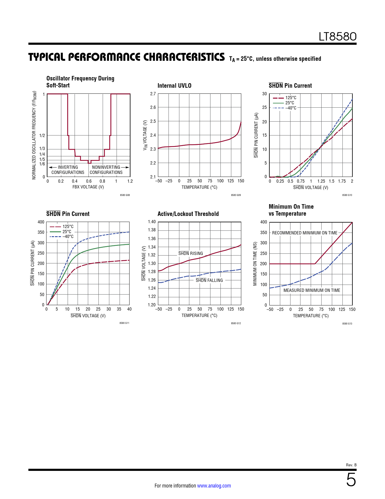 400 1.40 400 125°C 350 25°C 1.38 350 RECOMMENDED MINIMUM ON TIME –40°C 1.36 300 300 1.34 250 1.32 SHDN RISING 250 200 1.30 200 VOLTAGE (V) PIN CURRENT (µA) 150 1.28 150 SHDN 1.26 SHDN FALLING SHDN 100 MINIMUM ON TIME (NS) 100 1.24 MEASURED MINIMUM ON TIME 50 1.22 50 0 1.20 0 0 5 10 15 20 25 30 35 40 –50 –25 0 25 50 75 100 125 150 –50 –25 0 25 50 75 100 125 150 SHDN VOLTAGE (V) TEMPERATURE (°C) TEMPERATURE (°C) 8580 G11 8580 G12 8580 G13 Rev. B For more information www.analog.com 5 Document Outline Features Applications Typical Application Description Absolute Maximum Ratings Pin Configuration Order Information Electrical Characteristics Pin Functions Block Diagram Operation Applications Information Typical Applications Package Description Revision History Typical Application Related Parts