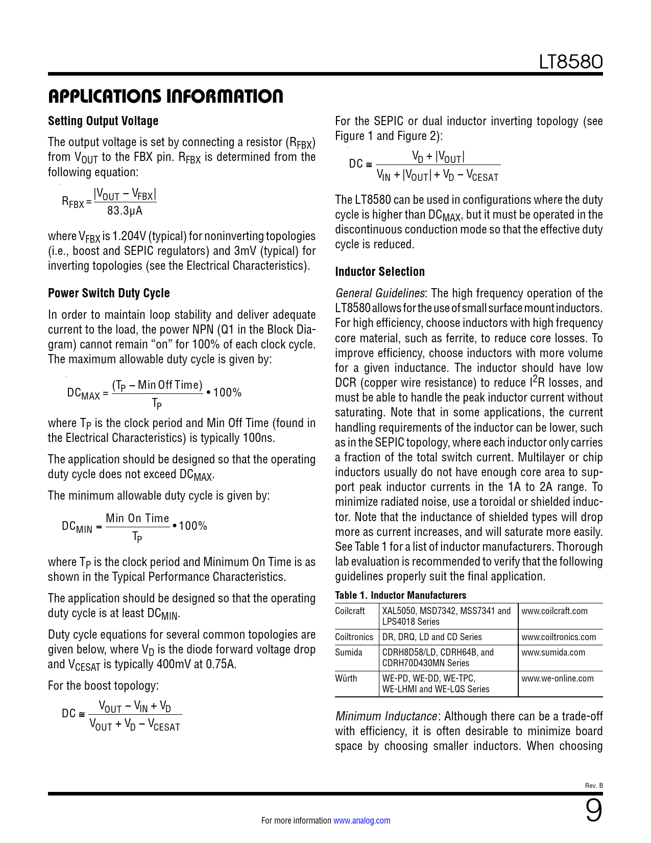 link to page 7 link to page 7 LT8580 APPLICATIONS INFORMATION Setting Output Voltage For the SEPIC or dual inductor inverting topology (see Figure 1 and Figure 2): The output voltage is set by connecting a resistor (RFBX) from V V OUT to the FBX pin. RFBX is determined from the DC ≅ D + |VOUT| following equation: VIN + |VOUT| + VD − VCESAT |V R OUT − VFBX| The LT8580 can be used in configurations where the duty FBX = 83.3µA cycle is higher than DCMAX, but it must be operated in the discontinuous conduction mode so that the effective duty where VFBX is 1.204V (typical) for noninverting topologies cycle is reduced. (i.e., boost and SEPIC regulators) and 3mV (typical) for inverting topologies (see the Electrical Characteristics). Inductor SelectionPower Switch Duty Cycle General Guidelines: The high frequency operation of the LT8580 allows for the use of small surface mount inductors. In order to maintain loop stability and deliver adequate For high efficiency, choose inductors with high frequency current to the load, the power NPN (Q1 in the Block Dia- core material, such as ferrite, to reduce core losses. To gram) cannot remain “on” for 100% of each clock cycle. improve efficiency, choose inductors with more volume The maximum allowable duty cycle is given by: for a given inductance. The inductor should have low (T DCR (copper wire resistance) to reduce I2R losses, and DC P − Min Off Time) MAX = • 100% must be able to handle the peak inductor current without TP saturating. Note that in some applications, the current where TP is the clock period and Min Off Time (found in handling requirements of the inductor can be lower, such the Electrical Characteristics) is typically 100ns. as in the SEPIC topology, where each inductor only carries The application should be designed so that the operating a fraction of the total switch current. Multilayer or chip duty cycle does not exceed DC inductors usually do not have enough core area to sup- MAX. port peak inductor currents in the 1A to 2A range. To The minimum allowable duty cycle is given by: minimize radiated noise, use a toroidal or shielded induc- Min On Time tor. Note that the inductance of shielded types will drop DCMIN = • 100% more as current increases, and will saturate more easily. TP See Table 1 for a list of inductor manufacturers. Thorough where TP is the clock period and Minimum On Time is as lab evaluation is recommended to verify that the following shown in the Typical Performance Characteristics. guidelines properly suit the final application. Table 1. Inductor Manufacturers The application should be designed so that the operating Coilcraft XAL5050, MSD7342, MSS7341 and www.coilcraft.com duty cycle is at least DCMIN. LPS4018 Series Duty cycle equations for several common topologies are Coiltronics DR, DRQ, LD and CD Series www.coiltronics.com given below, where VD is the diode forward voltage drop Sumida CDRH8D58/LD, CDRH64B, and www.sumida.com and V CDRH70D430MN Series CESAT is typically 400mV at 0.75A. Würth WE-PD, WE-DD, WE-TPC, www.we-online.com For the boost topology: WE-LHMI and WE-LQS Series V DC ≅ OUT − VIN + VD Minimum Inductance: Although there can be a trade-off VOUT + VD − VCESAT with efficiency, it is often desirable to minimize board space by choosing smaller inductors. When choosing Rev. B For more information www.analog.com 9 Document Outline Features Applications Typical Application Description Absolute Maximum Ratings Pin Configuration Order Information Electrical Characteristics Pin Functions Block Diagram Operation Applications Information Typical Applications Package Description Revision History Typical Application Related Parts