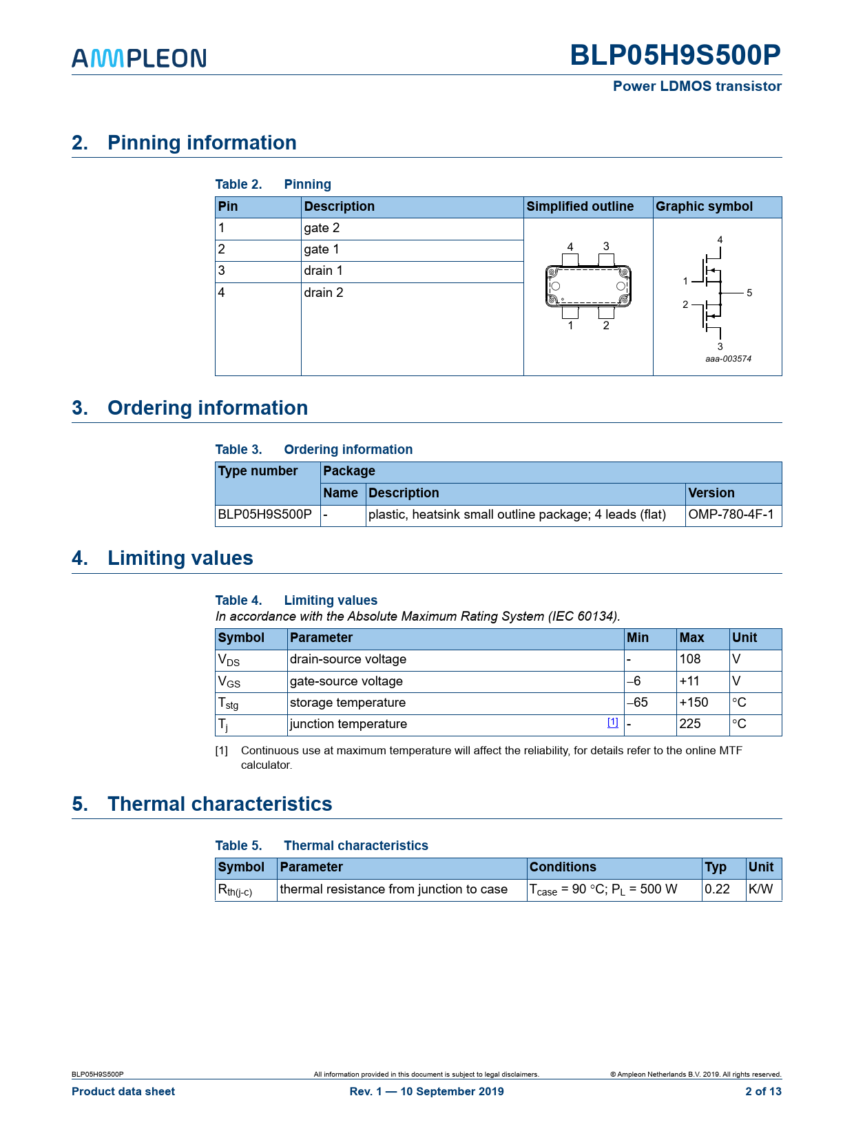 BLP05H9S500P. Power LDMOS transistor. 2. Pinning information. Table 2. Pinning. Pin. Description. Simplified outline. Graphic symbol