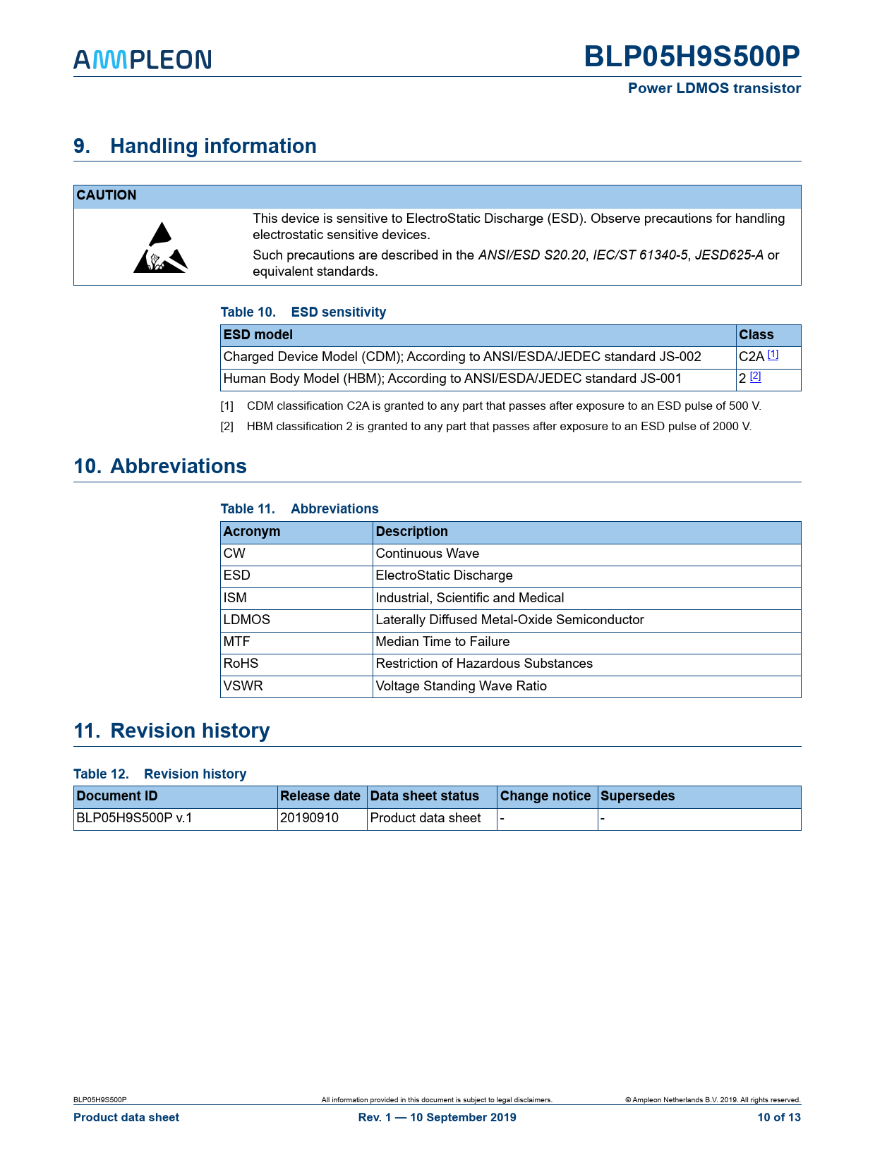 BLP05H9S500P. Power LDMOS transistor. 9. Handling information. CAUTION. Table 10. ESD sensitivity. ESD model. Class. 10. Abbreviations