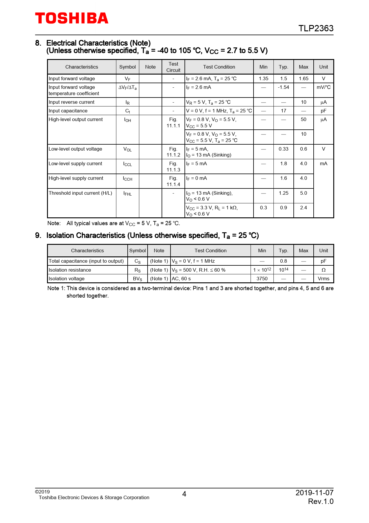 TLP2363. 8. Electrical. Characteristics. (Note). (Unless. otherwise. specified,. Ta. =. -40. to. 105. ,. VCC. =. 2.7. to. 5.5. V). Test. Characteristics. Symbol