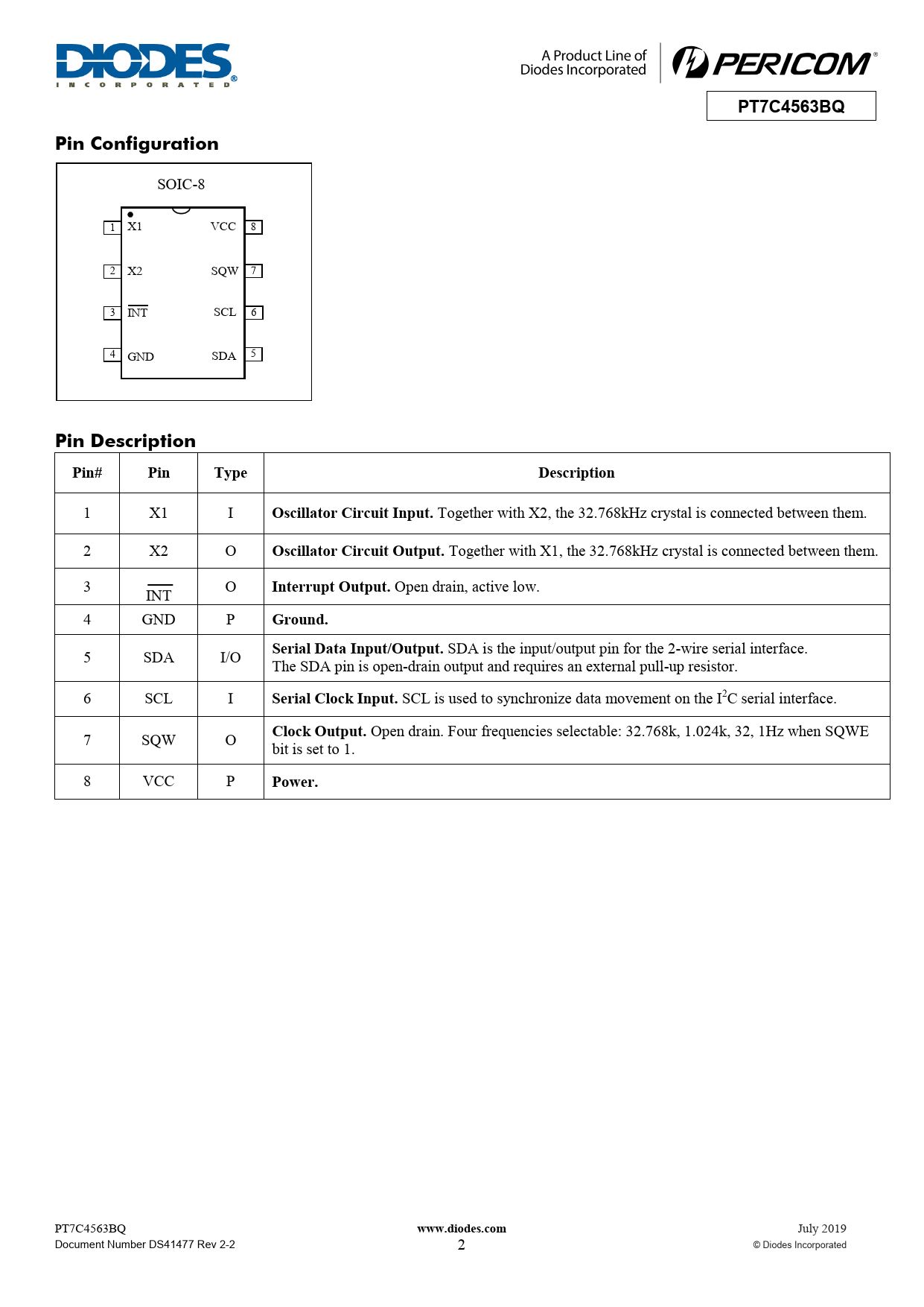 | 页数 / 页 | 19 / 2 — PT7C4563BQ. Pin Configuration. Pin Description. Pin#. Pin. Type. … |