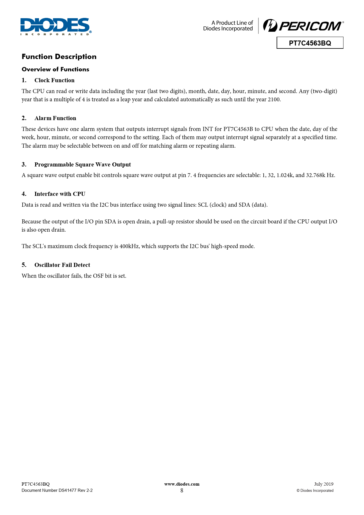 | 页数 / 页 | 19 / 8 — PT7C4563BQ. Function Description. Overview of Functions 1. Clock … |
