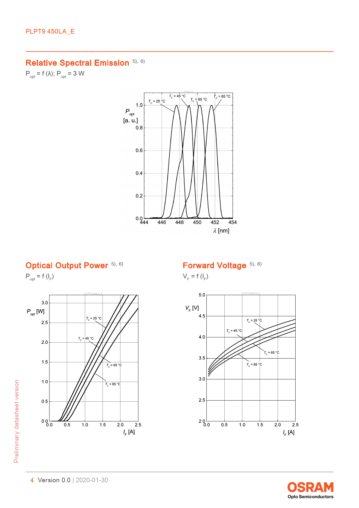 link to page 11 link to page 11 link to page 11 link to page 11 link to page 11 link to page 11 PLPT9 450LA_E Relative Spectral Emission 5), 6) P = f (λ); P = 3 W opt opt Optical Output Power 5), 6) Forward Voltage 5), 6) P = f (I ) V = f (I ) opt F F F Preliminary datasheet version 4 Version 0.0 | 2020-01-30