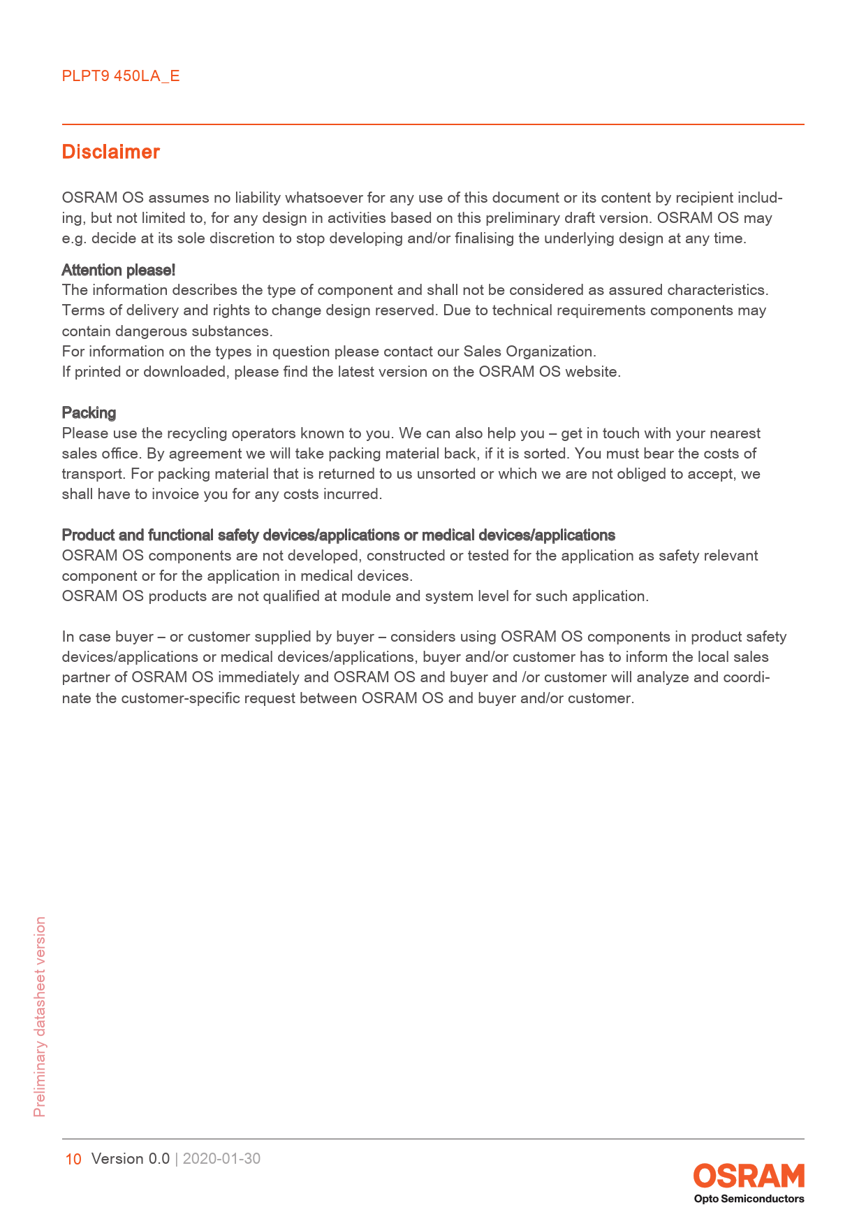 PLPT9 450LA_E Disclaimer OSRAM OS assumes no liability whatsoever for any use of this document or its content by recipient includ- ing, but not limited to, for any design in activities based on this preliminary draft version. OSRAM OS may e.g. decide at its sole discretion to stop developing and/or finalising the underlying design at any time. Attention please! The information describes the type of component and shall not be considered as assured characteristics. Terms of delivery and rights to change design reserved. Due to technical requirements components may contain dangerous substances. For information on the types in question please contact our Sales Organization. If printed or downloaded, please find the latest version on the OSRAM OS website. Packing Please use the recycling operators known to you. We can also help you – get in touch with your nearest sales office. By agreement we will take packing material back, if it is sorted. You must bear the costs of transport. For packing material that is returned to us unsorted or which we are not obliged to accept, we shall have to invoice you for any costs incurred. Product and functional safety devices/applications or medical devices/applications OSRAM OS components are not developed, constructed or tested for the application as safety relevant component or for the application in medical devices. OSRAM OS products are not qualified at module and system level for such application. In case buyer – or customer supplied by buyer – considers using OSRAM OS components in product safety devices/applications or medical devices/applications, buyer and/or customer has to inform the local sales partner of OSRAM OS immediately and OSRAM OS and buyer and /or customer will analyze and coordi- nate the customer-specific request between OSRAM OS and buyer and/or customer. Preliminary datasheet version 10 Version 0.0 | 2020-01-30