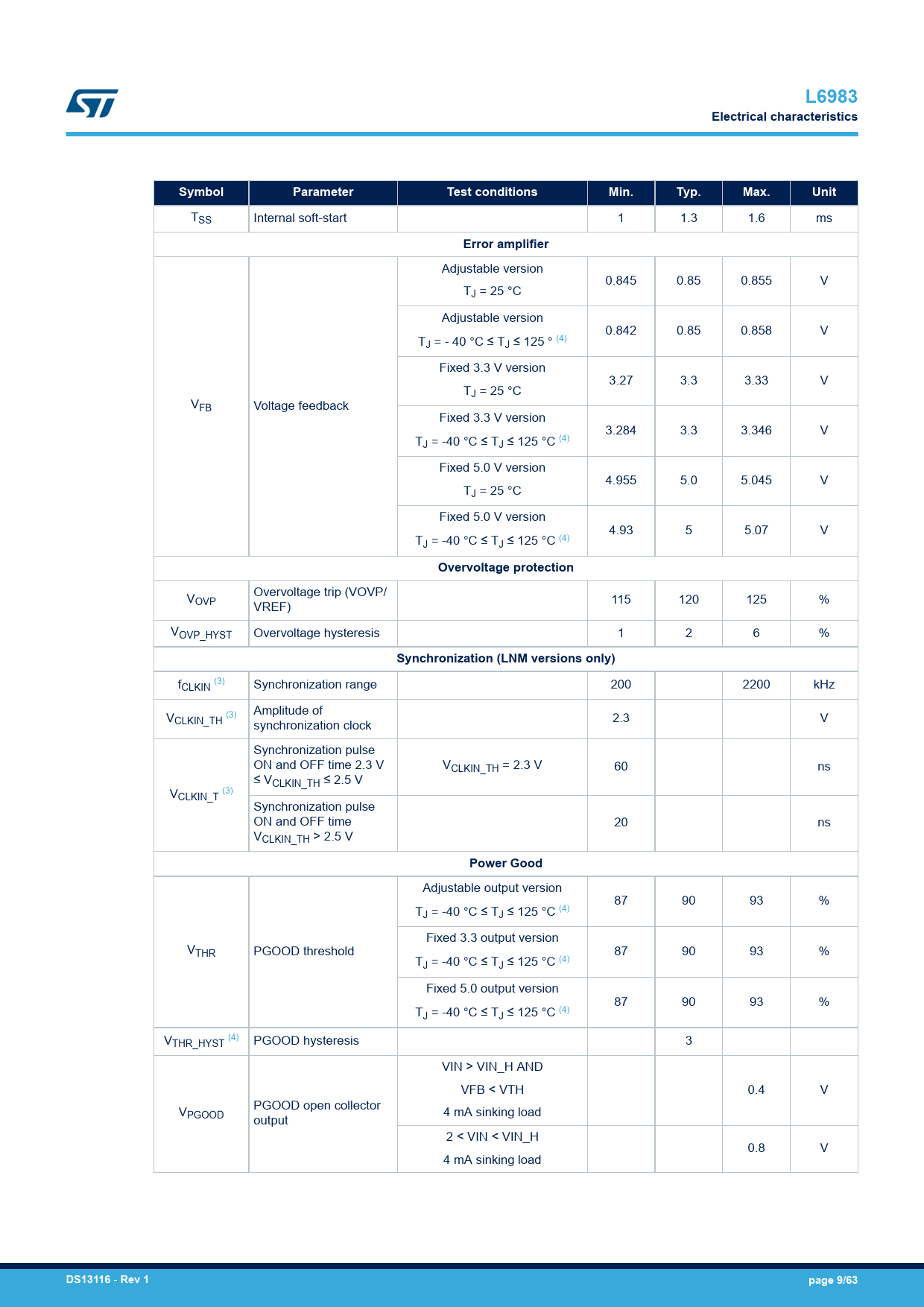页数 / 页63 / 9 — L6983. Electrical characteristics. Symbol. Parameter. Test conditions. …