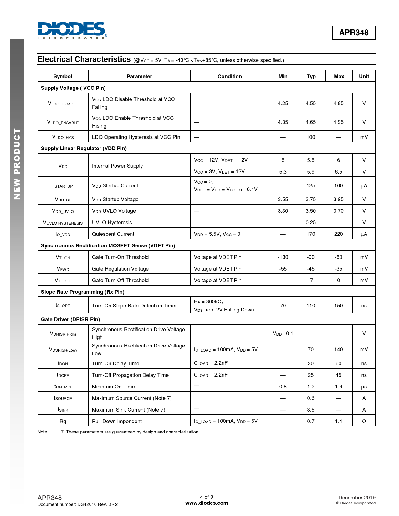 Synchronous Rectification Drive Voltage VDRISR(High) — VDD - 0.1 — — V High Synchronous Rectification Drive Voltage VDSRISR(Low) IG_LOAD = 100mA, VDD = 5V — 70 140 mV Low tDON Turn-On Delay Time CLOAD = 2.2nF — 30 60 ns tDOFF Turn-Off Propagation Delay Time CLOAD = 2.2nF — 25 45 ns tON_MIN Minimum On-Time — 0.8 1.2 1.6 µs ISOURCE Maximum Source Current (Note 7) — — 0.6 — A ISINK Maximum Sink Current (Note 7) — — 3.5 — A Rg Pull-Down Impendent IG_LOAD = 100mA, VDD = 5V — 0.7 1.4 Ω Note: 7. These parameters are guaranteed by design and characterization. APR348 4 of 9 December 2019 Document number: DS42016 Rev. 3 - 2