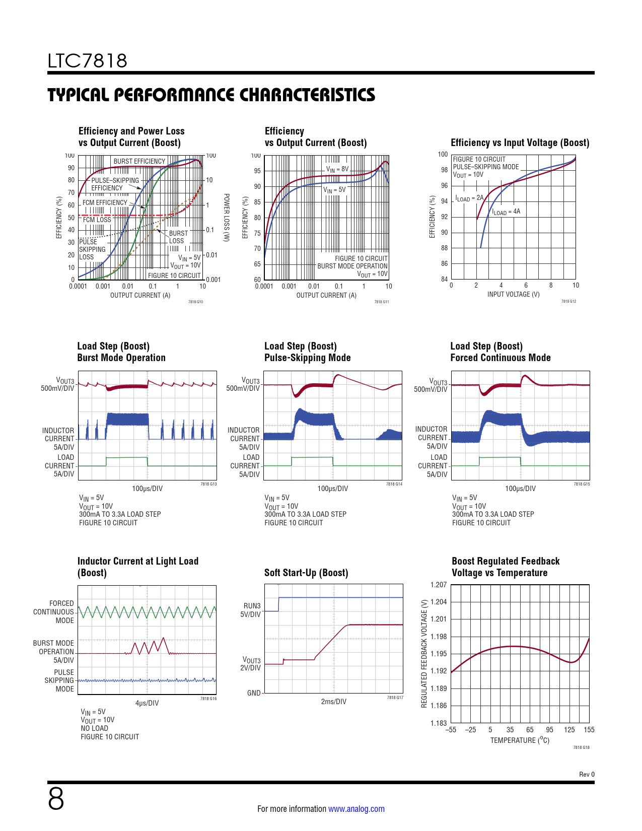 1.207 FORCED RUN3 1.204 CONTINUOUS 5V/DIV MODE 1.201 TAGE (V) 1.198 BURST MODE OPERATION 1.195 5A/DIV VOUT3 PULSE 2V/DIV 1.192 SKIPPING TED FEEDBACK VOL MODE 1.189 GND 7818 G17 4µs/DIV 7818 G16 2ms/DIV REGULA 1.186 VIN = 5V VOUT = 10V 1.183 NO LOAD –55 –25 5 35 65 95 125 155 FIGURE 10 CIRCUIT TEMPERATURE (oC) 7818 G18 Rev 0 8 For more information www.analog.com Document Outline Features Applications Typical Application Description Absolute Maximum Ratings Order Information Pin Configuration Electrical Characteristics Typical Performance Characteristics Pin Functions Functional Diagram Operation Applications Information Typical Applications Package Description Typical Application Related Parts