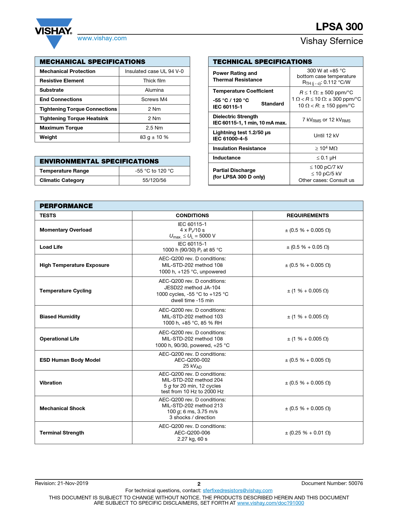 LPSA 300 www.vishay.com Vishay Sfernice MECHANICAL SPECIFICATIONSTECHNICAL SPECIFICATIONSMechanical Protection Insulated case UL 94 V-0 300 W at +85 °C Power Rating and bottom case temperature Resistive Element Thick film Thermal Resistance RTH (j - c): 0.112 °C/W Substrate Alumina Temperature Coefficient R 1 : ± 500 ppm/°C End Connections Screws M4 1 < R 10 : ± 300 ppm/°C -55 °C / 120 °C Standard 10 < R: ± 150 ppm/°C Tightening Torque Connections 2 Nm IEC 60115-1Tightening Torque Heatsink 2 Nm Dielectric Strength 7 kV IEC 60115-1, 1 min, 10 mA max. RMS or 12 kVRMS Maximum Torque 2.5 Nm Lightning test 1.2/50 μs Weight 83 g ± 10 % Until 12 kV IEC 61000-4-5Insulation Resistance 104 M Inductance 0.1 μH ENVIRONMENTAL SPECIFICATIONS 100 pC/7 kV Temperature Range -55 °C to 120 °C Partial Discharge 10 pC/5 kV (for LPSA 300 D only)Climatic Category 55/120/56 Other cases: Consult us PERFORMANCETESTSCONDITIONSREQUIREMENTS IEC 60115-1 Momentary Overload 4 x Pr/10 s ± (0.5 % + 0.005 ) Umax. UL = 5000 V IEC 60115-1 Load Life ± (0.5 % + 0.05 ) 1000 h (90/30) Pr at 85 °C AEC-Q200 rev. D conditions: High Temperature Exposure MIL-STD-202 method 108 ± (0.5 % + 0.005 ) 1000 h, +125 °C, unpowered AEC-Q200 rev. D conditions: JESD22 method JA-104 Temperature Cycling ± (1 % + 0.005 ) 1000 cycles, -55 °C to +125 °C dwell time -15 min AEC-Q200 rev. D conditions: Biased Humidity MIL-STD-202 method 103 ± (1 % + 0.005 ) 1000 h, +85 °C, 85 % RH AEC-Q200 rev. D conditions: Operational Life MIL-STD-202 method 108 ± (1 % + 0.005 ) 1000 h, 90/30, powered, +25 °C AEC-Q200 rev. D conditions: ESD Human Body Model AEC-Q200-002 ± (0.5 % + 0.005 ) 25 kVAD AEC-Q200 rev. D conditions: MIL-STD-202 method 204 Vibration ± (0.5 % + 0.005 ) 5 g for 20 min, 12 cycles test from 10 Hz to 2000 Hz AEC-Q200 rev. D conditions: MIL-STD-202 method 213 Mechanical Shock ± (0.5 % + 0.005 ) 100 g; 6 ms, 3.75 m/s 3 shocks / direction AEC-Q200 rev. D conditions: Terminal Strength AEC-Q200-006 ± (0.25 % + 0.01 ) 2.27 kg, 60 s Revision: 21-Nov-2019 2 Document Number: 50076 For technical questions, contact: sferfixedresistors@vishay.com THIS DOCUMENT IS SUBJECT TO CHANGE WITHOUT NOTICE. THE PRODUCTS DESCRIBED HEREIN AND THIS DOCUMENT ARE SUBJECT TO SPECIFIC DISCLAIMERS, SET FORTH AT www.vishay.com/doc?91000