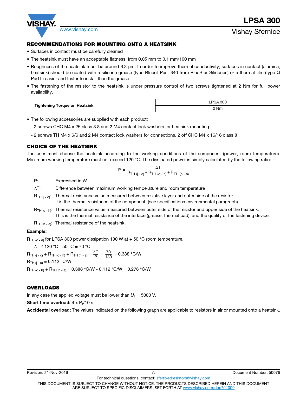 • Surfaces in contact must be carefully cleaned • The heatsink must have an acceptable flatness: from 0.05 mm to 0.1 mm/100 mm • Roughness of the heatsink must be around 6.3 μm. In order to improve thermal conductivity, surfaces in contact (alumina, heatsink) should be coated with a silicone grease (type Bluesil Past 340 from BlueStar Silicones) or a thermal film (type Q Pad II) easier and faster to install than the grease. • The fastening of the resistor to the heatsink is under pressure control of two screws tightened at 2 Nm for full power availability. LPSA 300