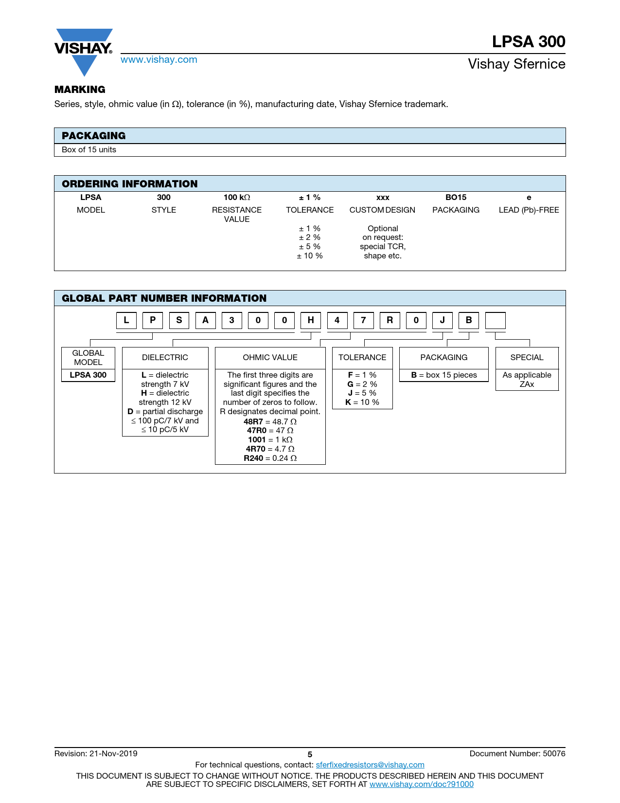 LPSA 300. MARKING. PACKAGING. ORDERING INFORMATION. LPSA. 300. 100 k. ± 1 %. xxx. BO15. GLOBAL PART NUMBER INFORMATION. 48R7. 47R0. 1001. 4R70. R240