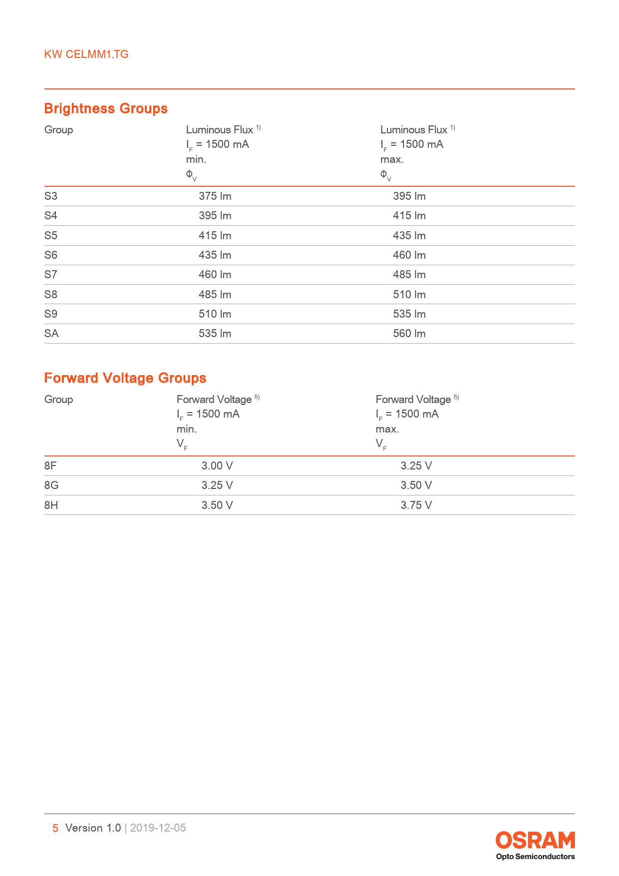 link to page 24 link to page 24 link to page 24 link to page 24 KW CELMM1.TG Brightness Groups Group Luminous Flux 1) Luminous Flux 1) I = 1500 mA I = 1500 mA F F min. max. Φ Φ V V S3 375 lm 395 lm S4 395 lm 415 lm S5 415 lm 435 lm S6 435 lm 460 lm S7 460 lm 485 lm S8 485 lm 510 lm S9 510 lm 535 lm SA 535 lm 560 lm Forward Voltage Groups Group Forward Voltage 5) Forward Voltage 5) I = 1500 mA I = 1500 mA F F min. max. V V F F 8F 3.00 V 3.25 V 8G 3.25 V 3.50 V 8H 3.50 V 3.75 V 5 Version 1.0 | 2019-12-05