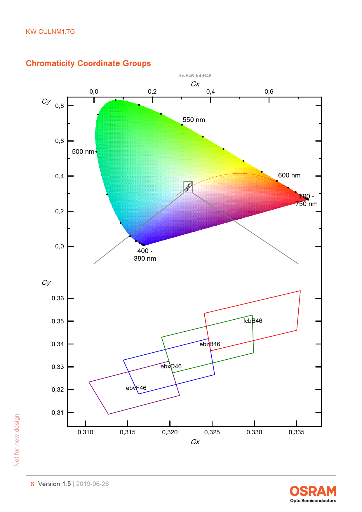 KW. CULNM1.TG. Chromaticity. Coordinate. Groups. ebvF46-fcbB46. Cx. 0,0. 0,2. 0,4. 0,6. Cy. 0,8. 550. nm. 0,6. 500. nm. 0,4. 600. nm. 700. -. 750. nm. 0,2. 0,0. 400. -. 380. nm. Cy