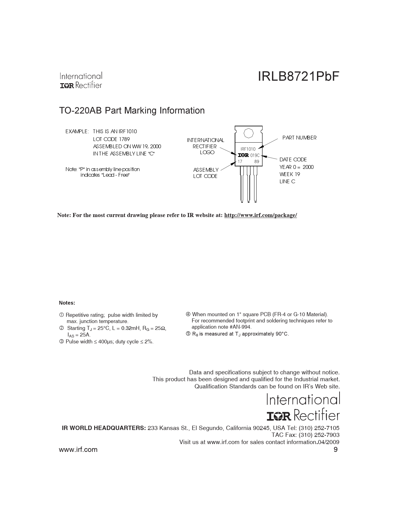 IRLB8721PbF TO-220AB Part Marking Information EXAMPLE: T HIS IS AN IRF1010 LOT CODE 1789 INTERNATIONAL PART NUMBER ASSEMBLED ON WW 19, 2000 RECTIFIER IN T HE ASSEMBLY LINE "C" LOGO DAT E CODE Note: "P" in assembly line position ASSEMBLY YEAR 0 = 2000 indicates "Lead - Free" LOT CODE WEEK 19 LINE C