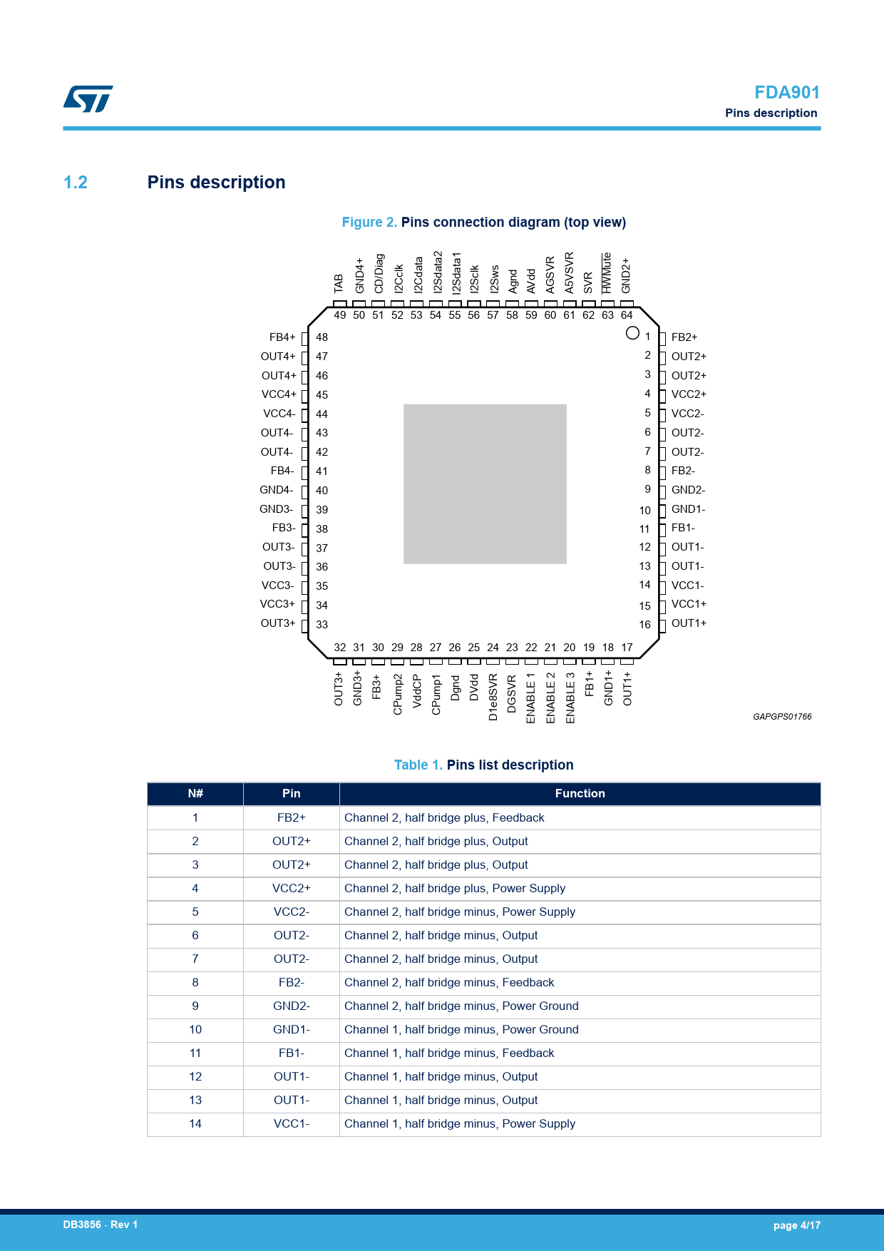 FDA901. Pins description. 1.2. Figure 2. Pins connection diagram (top view). Table 1. Pins list description. Pin. Function. DB3856