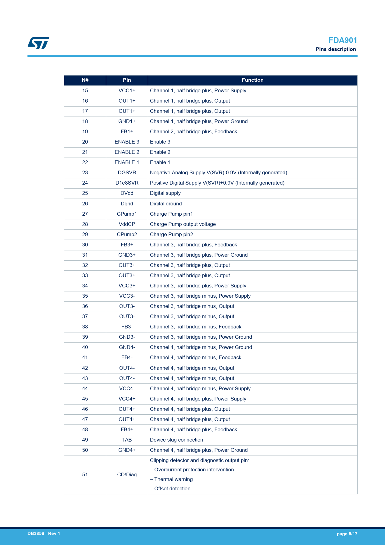 | 页数 / 页 | 17 / 5 — FDA901. Pins description. Pin. Function. DB3856. Rev 1. page 5/17 |
